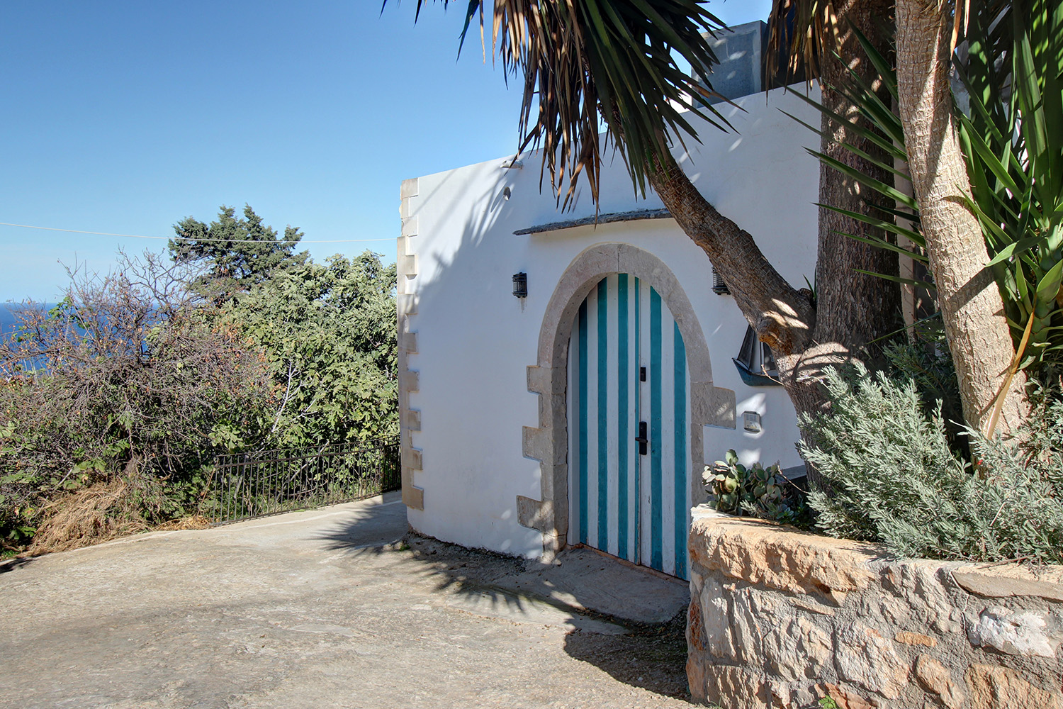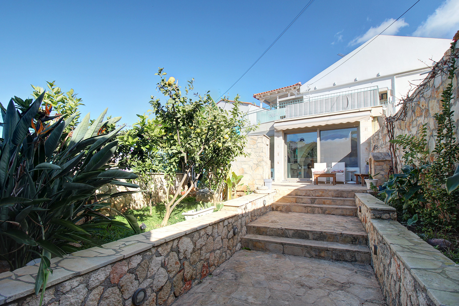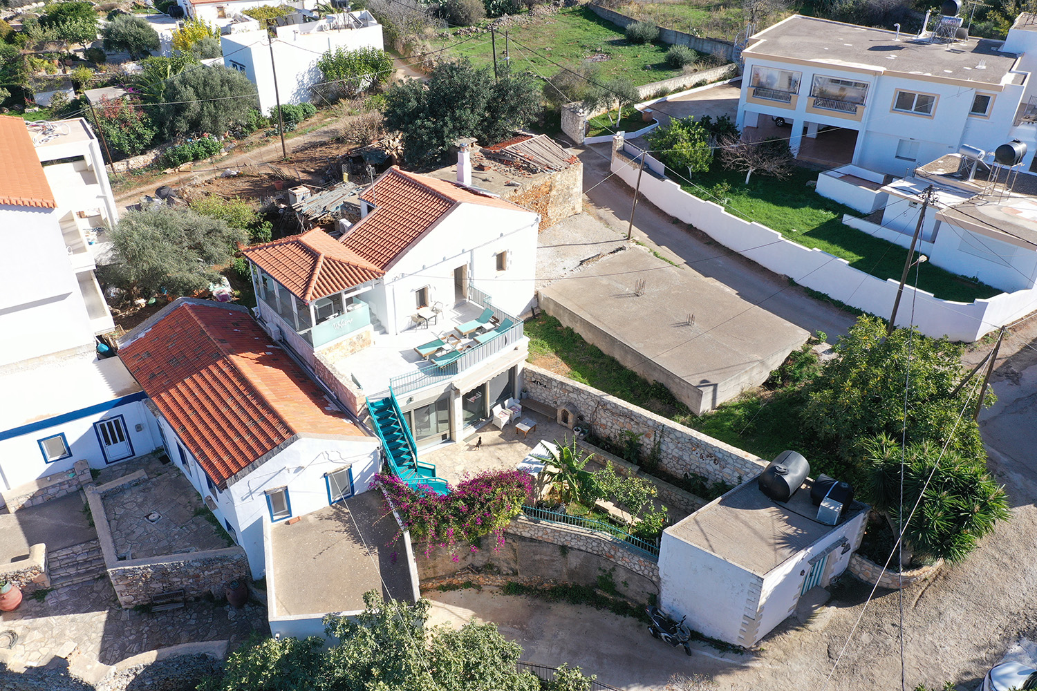 Το κυρίως κτίσμα είναι σε δύο επίπεδα. Κάτω έχει φτιαχτεί μία άνετη και φωτεινή κατοικία, ενώ επάνω βρίσκονται δύο ανεξάρτητοι ξενώνες όπου μπορείτε να φιλοξενείτε φίλους ή να κάνετε τουριστική εκμίσθωση και να λαμβάνετε ένα σημαντικό ετήσιο εισόδημα. Ανάμεσα στο χαγιάτι και στην κατοικία έχει φτιαχτεί μία άνετη λιθόστρωτη αυλή με καλή ιδιωτικότητα. Πριν την είσοδο της οικίας υπάρχουν, επίσης, παρτέρια με ανθόκηπο και ένα χτιστό μπάρμπεκιου. Μία εξωτερική σκάλα οδηγεί στον όροφο ο οποίος έχει εντυπωσιακή θέα στη θάλασσα. Εδώ θα βρείτε μεγάλο χώρο για ηλιοθεραπεία, καθώς και μία στεγασμένη βεράντα η οποία λειτουργεί ως χώρος πρωινού, κλείνει με κάθετες τέντες και μπορεί να χρησιμοποιηθεί όλο τον χρόνο.