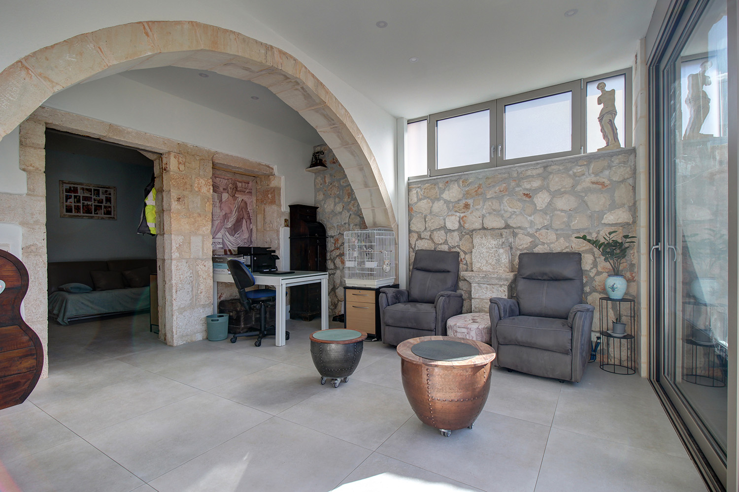 Η κατοικία είναι σε ένα εξαιρετικά γραφικό χωριό του δήμου Αποκορώνου το οποίο είναι χτισμένο σε μία πλαγιά από όπου κοιτά πανοραμικά επάνω από τον κόλπο της Σούδας. Πρόκειται για μία παλαιά πέτρινη κατοικία η οποία έχει επισκευαστεί πλήρως πριν από κάποια έτη, ενώ μόλις το 2020 έγινε επιπρόσθετη πλήρης ανακαίνιση ώστε σήμερα να διατίθεται ένα καλαίσθητο, λειτουργικό και σύγχρονο ακίνητο.