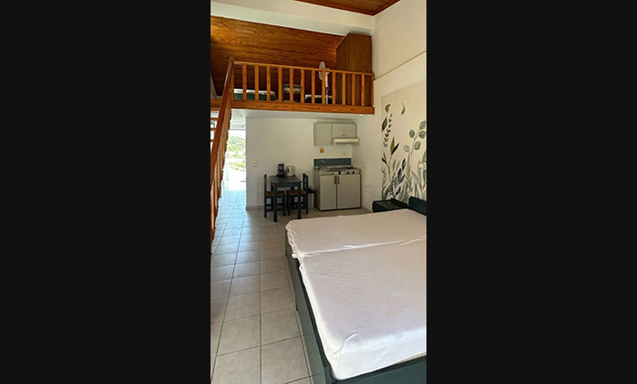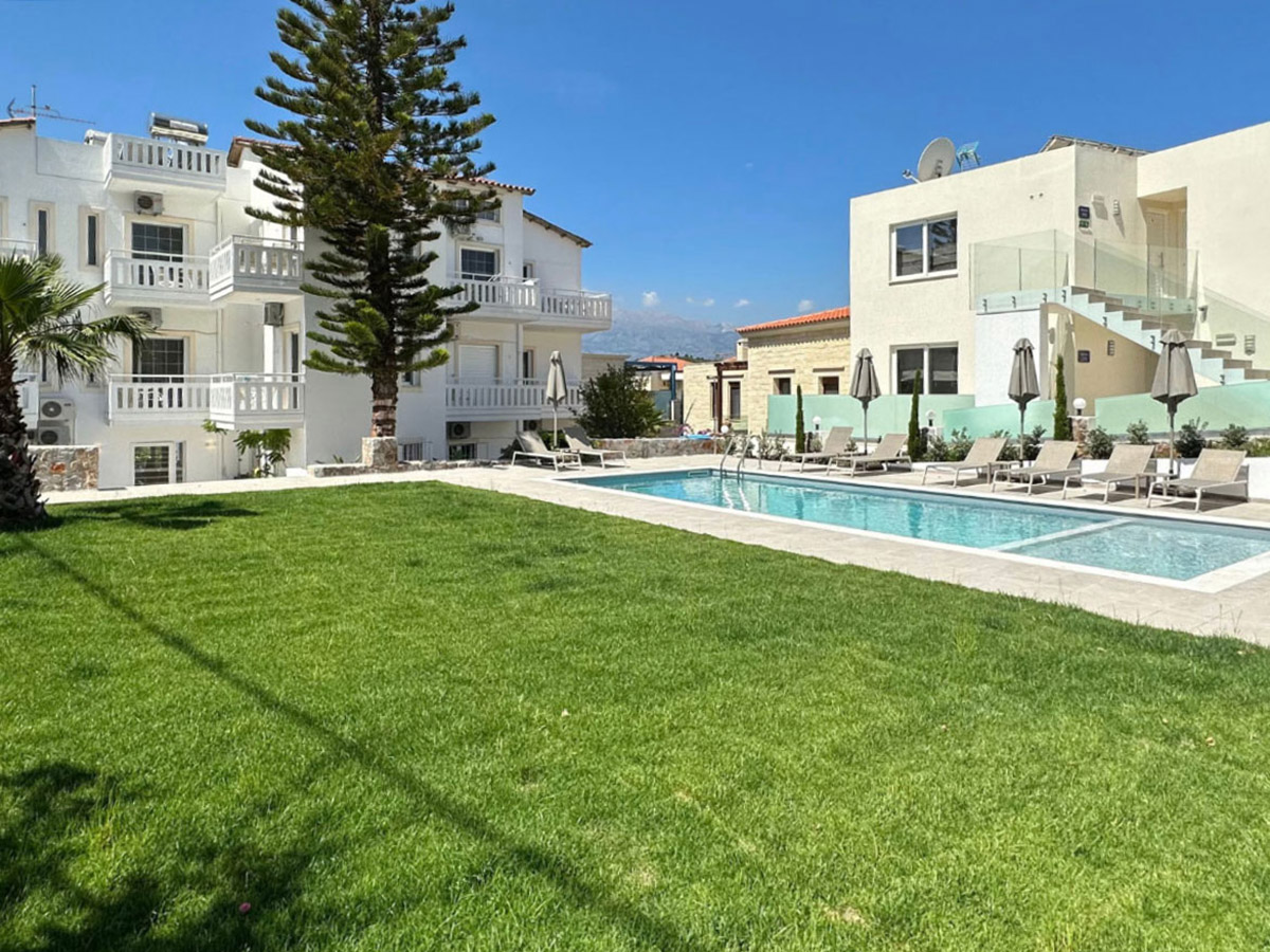 Το κτήριο είναι σε τρία επίπεδα. Υπάρχει μελέτη για συνολικά 12 ανεξάρτητα δωμάτια ενώ αυτή τη στιγμή υπάρχουν 1 μεγάλο σε στυλ μεζονέτας, 4 δίχωρα και 5 studio. Όλα τα δωμάτια κοιτούν νότια προς τα Λευκά Όρη, με εξαίρεση ένα το οποίο βλέπει στη θάλασσα και επάνω από τον κόλπο της Αλμυρίδας. Το ξενοδοχείο είναι μία εξαιρετική και εύκολα διαχειρίσιμη επιλογή αν θέλετε να το δουλέψετε οικογενειακά. Επίσης η τοποθεσία και τα χαρακτηριστικά του να μπορούν να σας προσφέρουν έναν δελεαστικό χρόνο απόσβεσης.