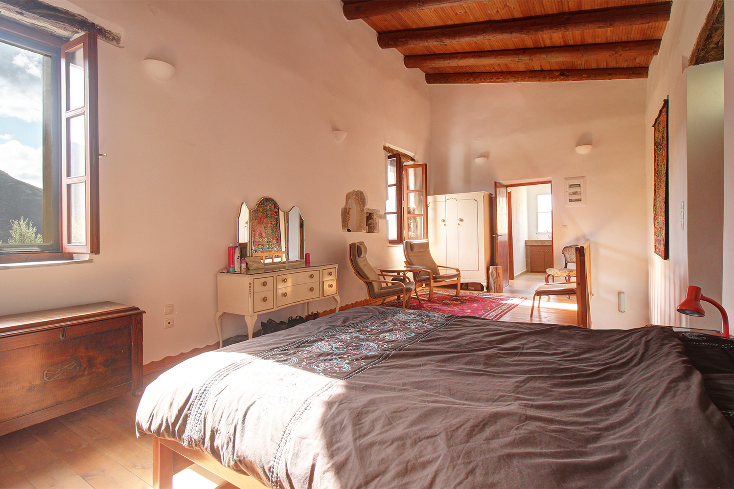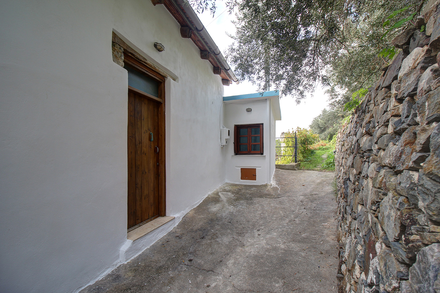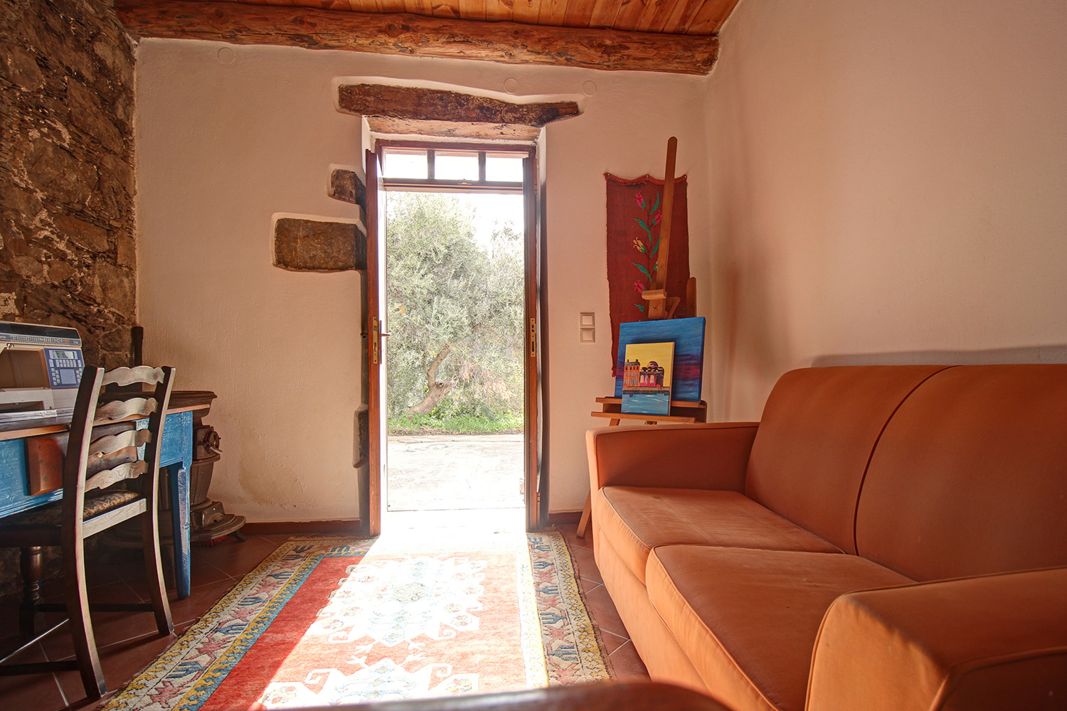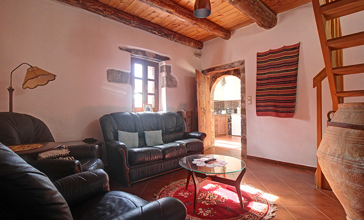 Το κυρίως σπίτι είναι προσανατολισμένο ώστε να κοιτά εν μέρει προς το χωριό, αλλά και επάνω από έναν κατάφυτο κάμπο με τη θέα να καταλήγει στο βάθος μέχρι τη θάλασσα. Οι κύριοι χώροι είναι στο κάτω επίπεδο όπου βρίσκονται στη σειρά η κουζίνα, σαλόνι, και ένα υπνοδωμάτιο το οποίο αυτή τη στιγμή είναι διαμορφωμένο ως γραφείο. Κατά το πως ορίζει η παραδοσιακή τοπική αρχιτεκτονική, όλοι οι χώροι είναι τοποθετημένοι σε σειρά, ενώ επικοινωνούν μεμονωμένα με την αυλή ή τον κήπο. Η κουζίνα περιλαμβάνει ξυλόσομπα, την τραπεζαρία, καθώς και την παλιά παρασιά του σπιτιού. Μία ξύλινη σκάλα οδηγεί από το σαλόνι στον επάνω επίπεδο όπου μας υποδέχεται ένας μεγάλος οντάς. Εδώ έχουν διαμορφωθεί ένα κύριο υπνοδωμάτιο με καθιστικό. Μία πόρτα στο βάθος οδηγεί σε ένα ευρύχωρο μπάνιο, και σε ένα επιπλέον υπνοδωμάτιο.