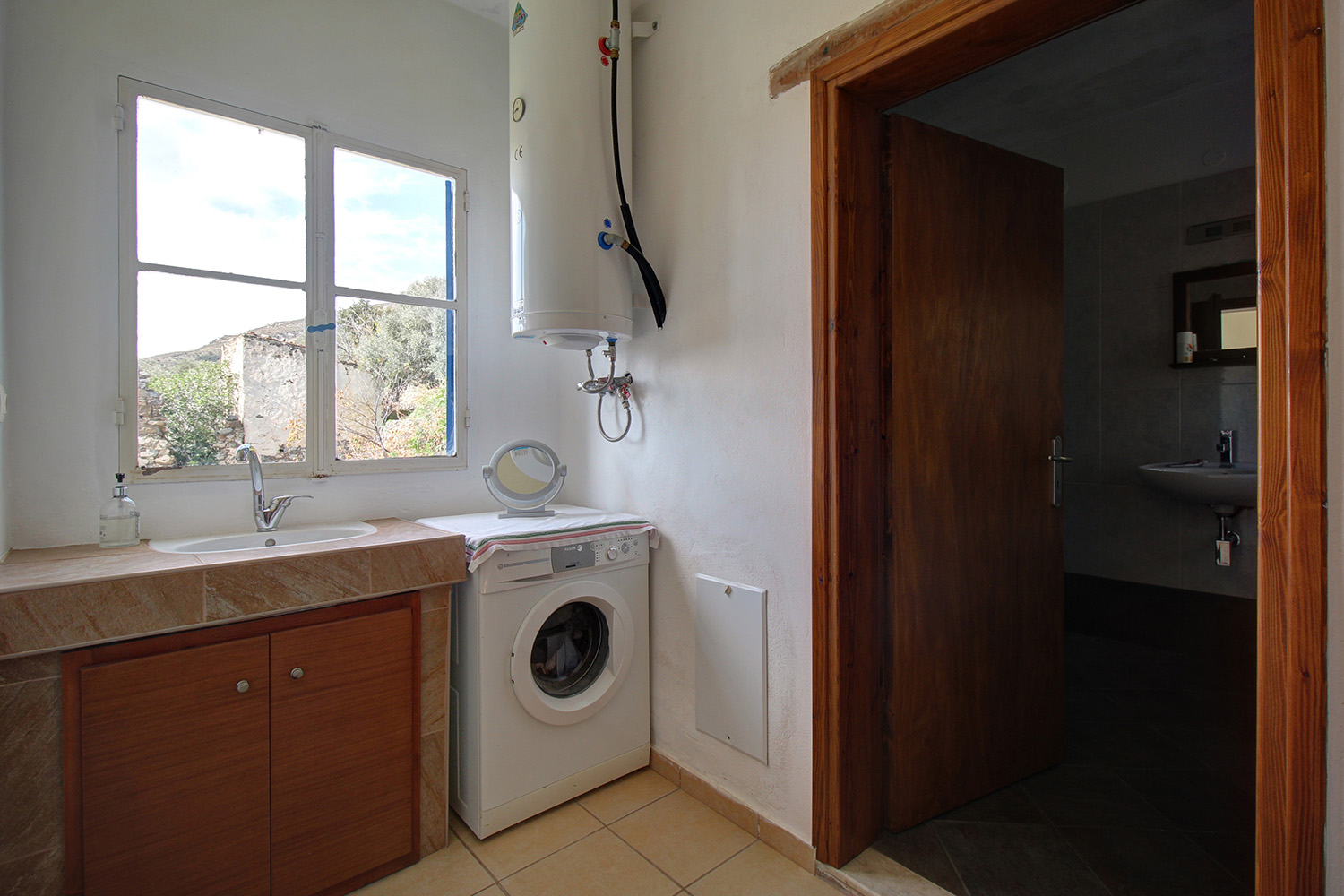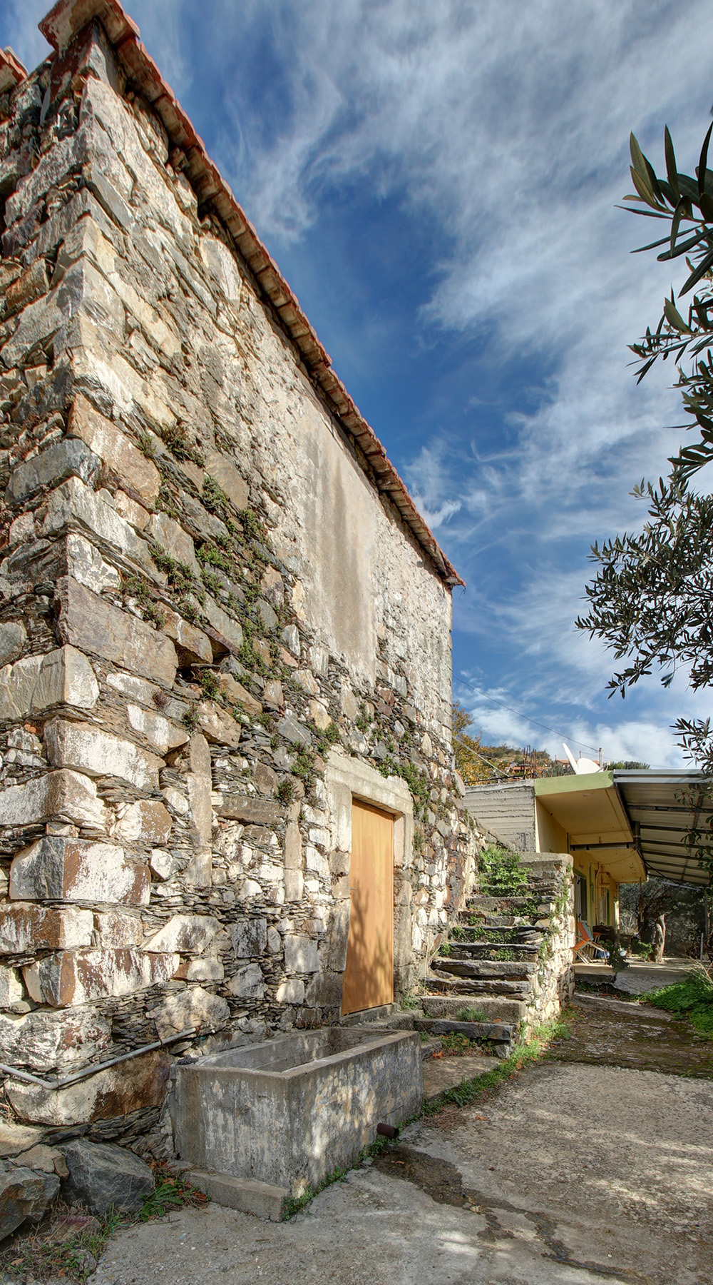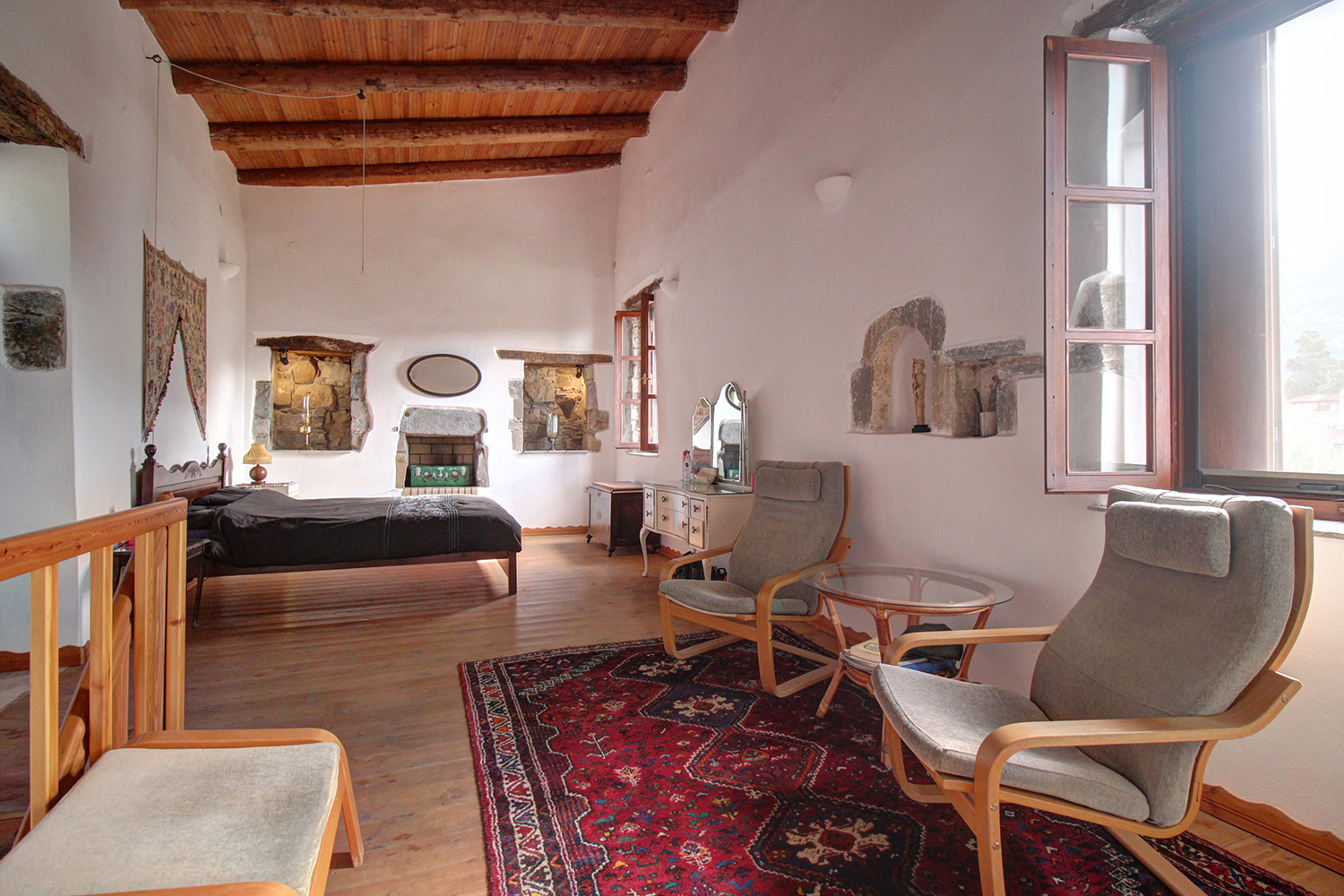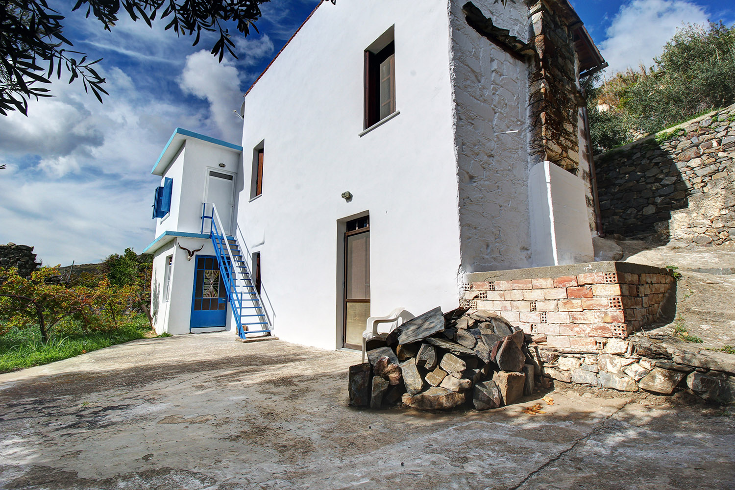 Το κυρίως σπίτι είναι προσανατολισμένο ώστε να κοιτά εν μέρει προς το χωριό, αλλά και επάνω από έναν κατάφυτο κάμπο με τη θέα να καταλήγει στο βάθος μέχρι τη θάλασσα. Οι κύριοι χώροι είναι στο κάτω επίπεδο όπου βρίσκονται στη σειρά η κουζίνα, σαλόνι, και ένα υπνοδωμάτιο το οποίο αυτή τη στιγμή είναι διαμορφωμένο ως γραφείο. Κατά το πως ορίζει η παραδοσιακή τοπική αρχιτεκτονική, όλοι οι χώροι είναι τοποθετημένοι σε σειρά, ενώ επικοινωνούν μεμονωμένα με την αυλή ή τον κήπο. Η κουζίνα περιλαμβάνει ξυλόσομπα, την τραπεζαρία, καθώς και την παλιά παρασιά του σπιτιού. Μία ξύλινη σκάλα οδηγεί από το σαλόνι στον επάνω επίπεδο όπου μας υποδέχεται ένας μεγάλος οντάς. Εδώ έχουν διαμορφωθεί ένα κύριο υπνοδωμάτιο με καθιστικό. Μία πόρτα στο βάθος οδηγεί σε ένα ευρύχωρο μπάνιο, και σε ένα επιπλέον υπνοδωμάτιο.