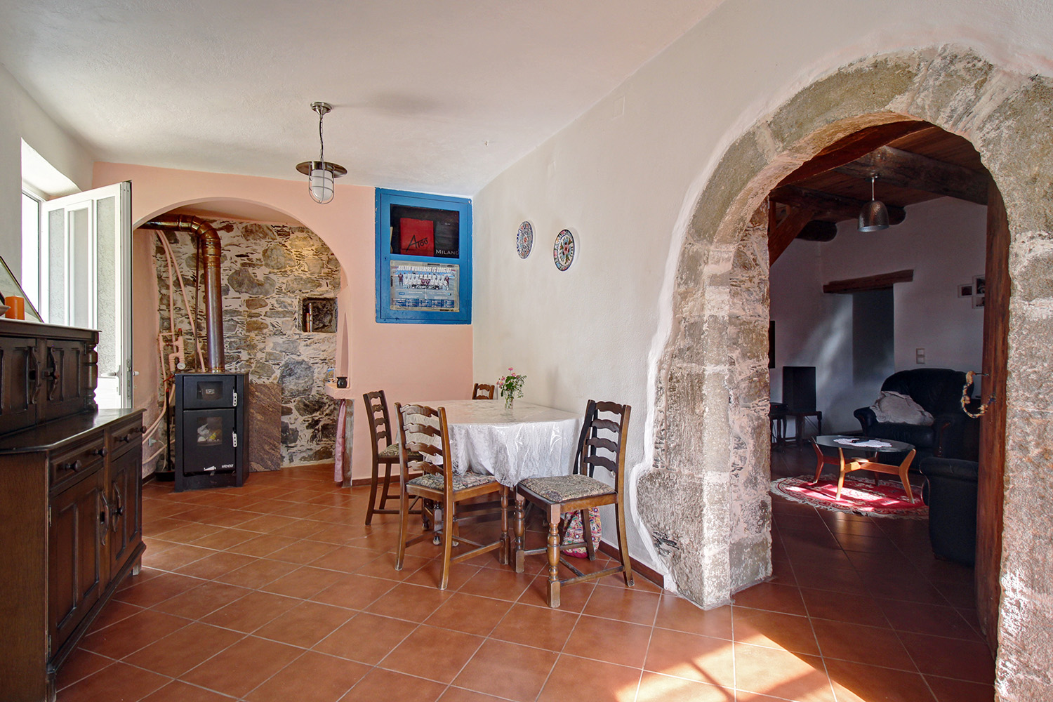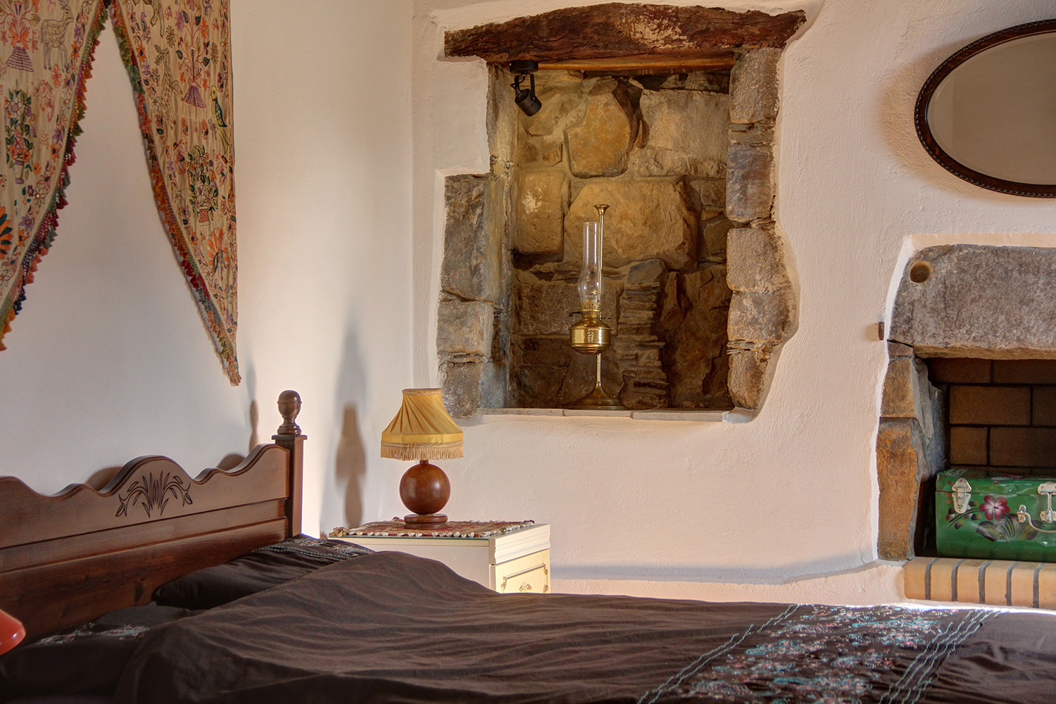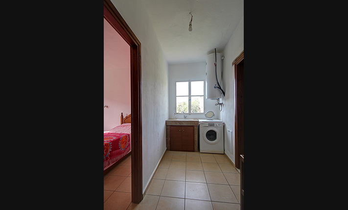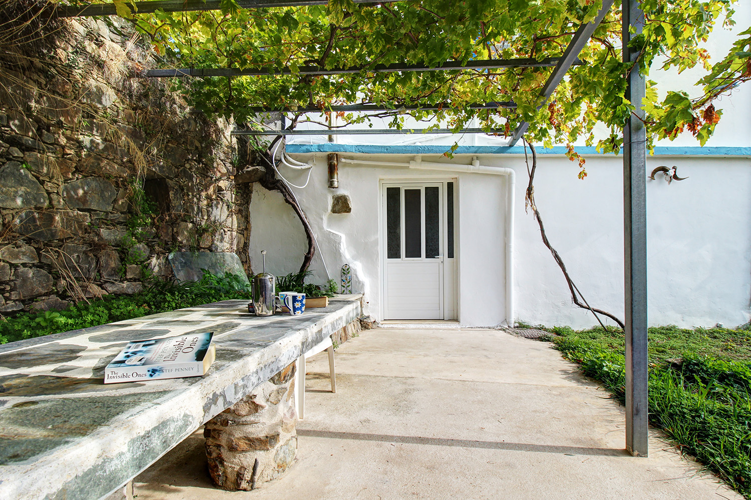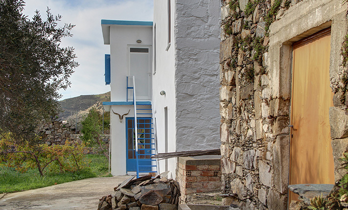 Το κυρίως σπίτι είναι προσανατολισμένο ώστε να κοιτά εν μέρει προς το χωριό, αλλά και επάνω από έναν κατάφυτο κάμπο με τη θέα να καταλήγει στο βάθος μέχρι τη θάλασσα. Οι κύριοι χώροι είναι στο κάτω επίπεδο όπου βρίσκονται στη σειρά η κουζίνα, σαλόνι, και ένα υπνοδωμάτιο το οποίο αυτή τη στιγμή είναι διαμορφωμένο ως γραφείο. Κατά το πως ορίζει η παραδοσιακή τοπική αρχιτεκτονική, όλοι οι χώροι είναι τοποθετημένοι σε σειρά, ενώ επικοινωνούν μεμονωμένα με την αυλή ή τον κήπο. Η κουζίνα περιλαμβάνει ξυλόσομπα, την τραπεζαρία, καθώς και την παλιά παρασιά του σπιτιού. Μία ξύλινη σκάλα οδηγεί από το σαλόνι στον επάνω επίπεδο όπου μας υποδέχεται ένας μεγάλος οντάς. Εδώ έχουν διαμορφωθεί ένα κύριο υπνοδωμάτιο με καθιστικό. Μία πόρτα στο βάθος οδηγεί σε ένα ευρύχωρο μπάνιο, και σε ένα επιπλέον υπνοδωμάτιο.