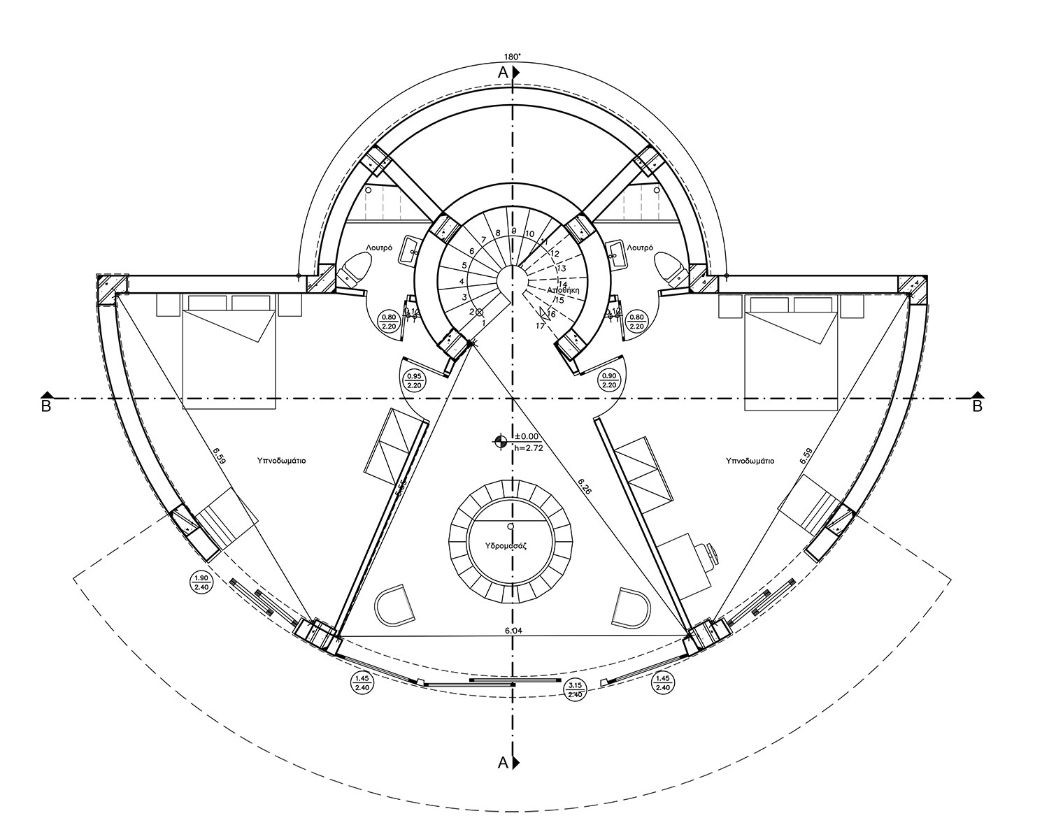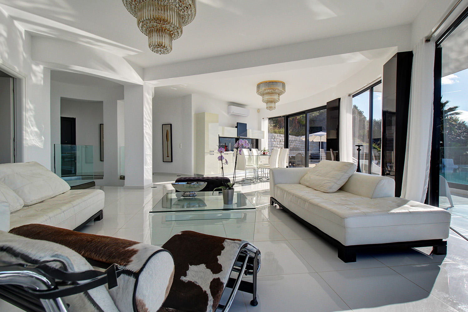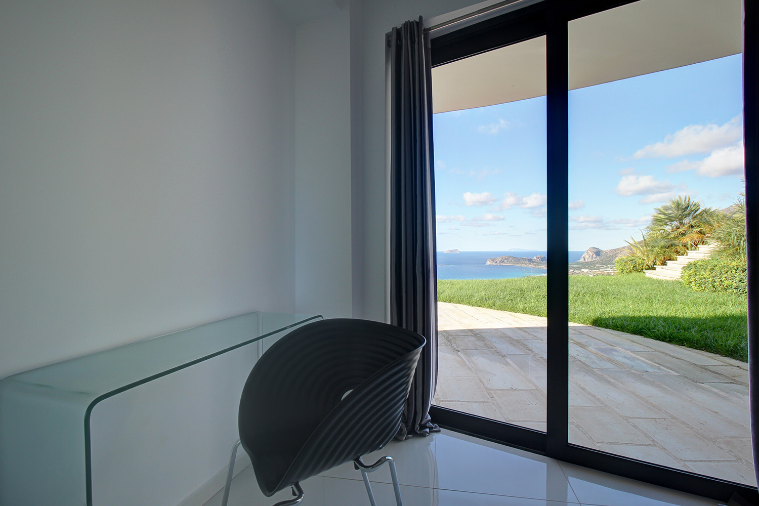 Κύριο χαρακτηριστικό σε όλους τους χώρους είναι οι μεγάλες τζαμαρίες ώστε τα δωμάτια να βρίσκονται σε άμεση επικοινωνία με τη θάλασσα. Επάνω μας υποδέχεται ένας ενιαίος χώρος σαλονιού, τραπεζαρίας και κουζίνας. Η εσωτερική κυκλική σκάλα που οδηγεί κάτω είναι κεντρικό αρχιτεκτονικό σημείο αναφοράς ενώ το καμπύλο σχήμα της δυτικής όψης στο βάθος βοηθά ώστε το φως να διαχέεται άπλετο και να κυριαρχεί στον χώρο. Δίπλα στο σαλόνι έχει τοποθετηθεί το ένα από τα υπνοδωμάτια καθώς και μπάνιο του ορόφου. Κατεβαίνοντας στο κάτω επίπεδο μας υποδέχεται μία σάλα με ένα κεντρικό τζακούζι, όπου και εδώ τα μεγάλα ανοίγματα θολώνουν τη διάκριση μεταξύ του εσωτερικού και του κήπου και ενισχύουν τη θερινή αίσθηση της οικίας. Πόρτες αριστερά και δεξιά της σάλας οδηγούν σε δύο μεγάλα υπνοδωμάτια, κάθε ένα από τα οποία έχει ενσωματωμένο δικό του μπάνιο.