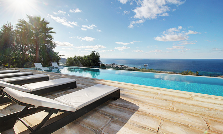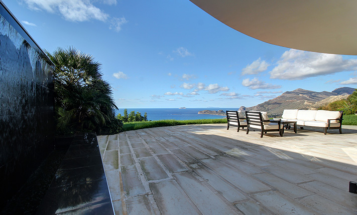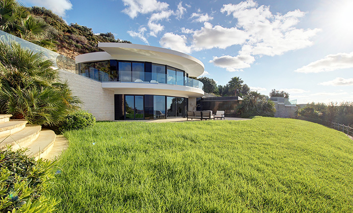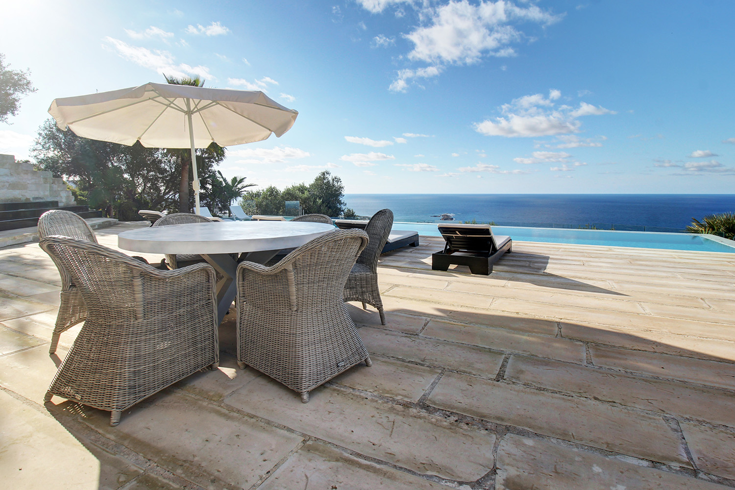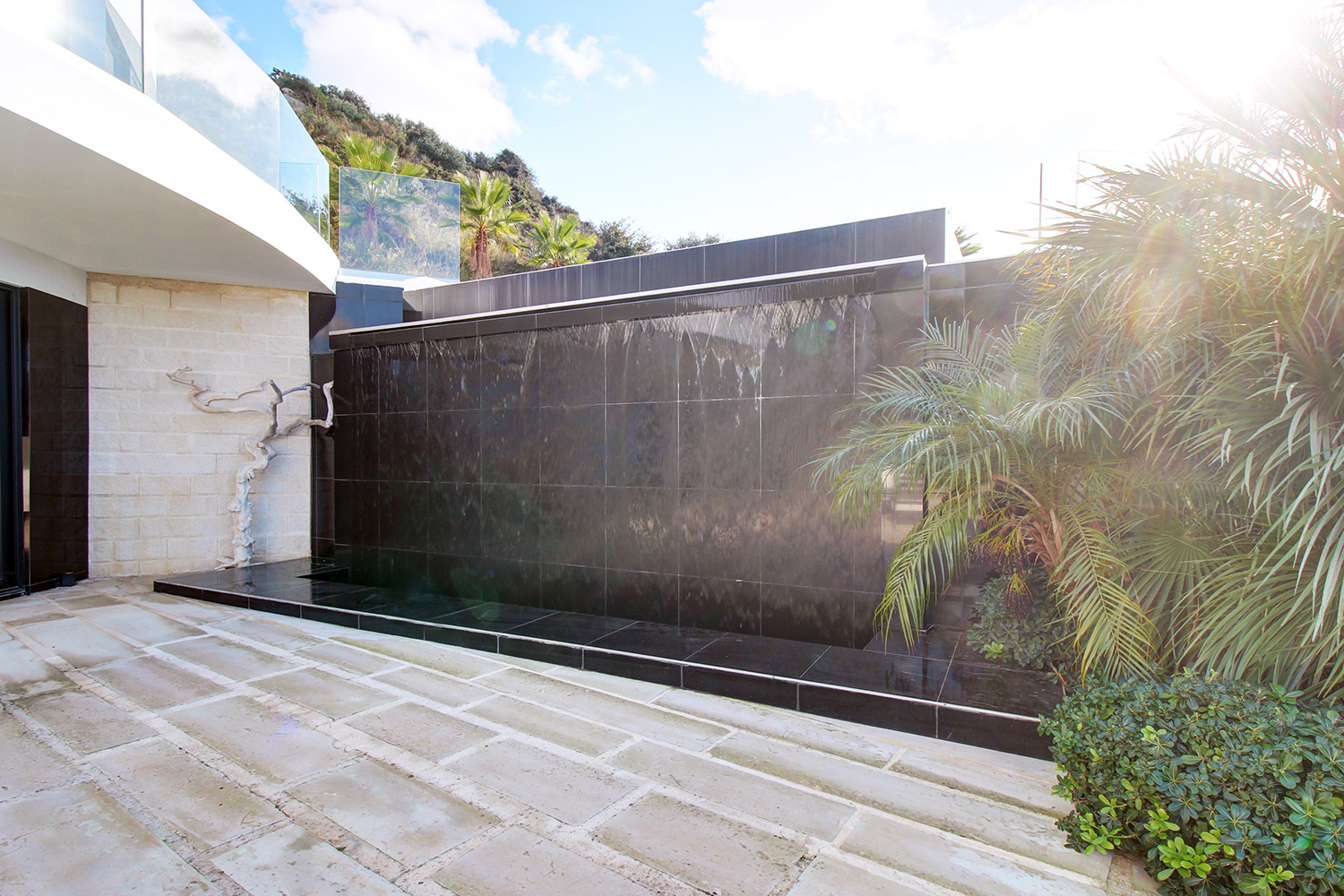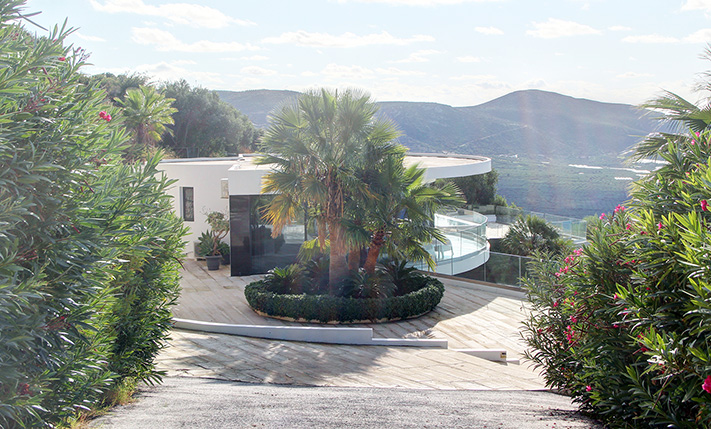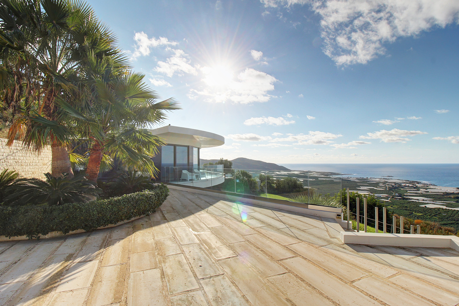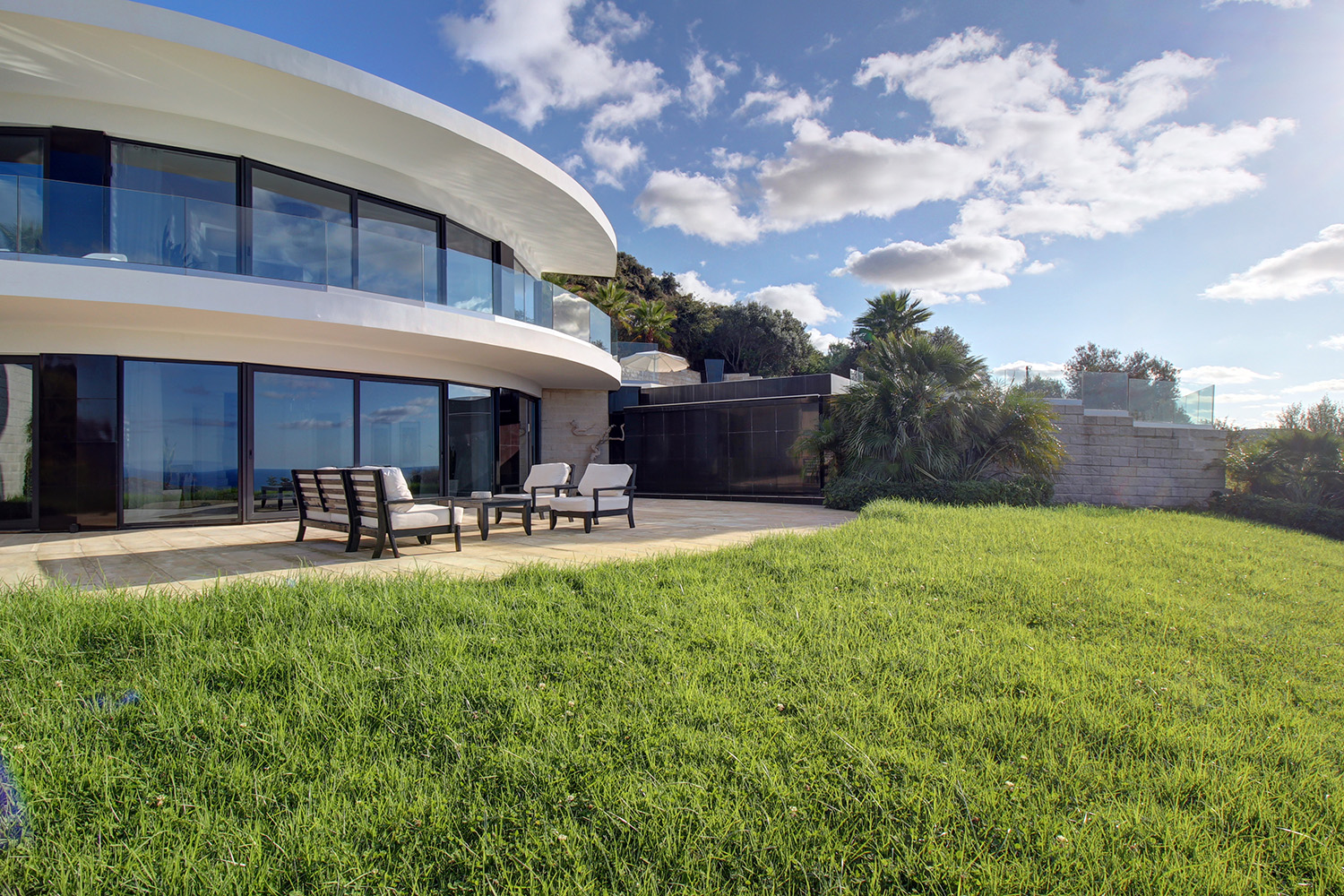 Το ακίνητο κατασκευάστηκε ώστε να συνάδει με τις πολυτελείς απαιτήσεις της περιοχής. Καταλαμβάνει ένα άνετο οικόπεδο στο οποίο ως έναν βαθμό έχουν διατηρηθεί οι παραδοσιακές αναβαθμίδες του φυσικού εδάφους ενώ μετά από αυτές το κτίριο χωρίζεται σε δύο ισόγεια επίπεδα που βγαίνουν απευθείας σε αυλή ή κήπο. Μέχρι την κύρια είσοδο έχει φτιαχτεί ένας ιδιωτικός δρόμος και ως εκ τούτου το ακίνητο να είναι τοποθετημένο στο βάθος και προσφέρει απόλυτη ιδιωτικότητα. Ένα μεγάλο μέρος του περιβάλλοντα χώρου είναι διαμορφωμένο με γρασίδι και αυλές ενώ ένα τμήμα παραμένει ελεύθερο σε περίπτωση που θέλετε να προσθέσετε έναν μεγάλο θεματικό κήπο, ελαιώνα ή διάφορα καρποφόρα δέντρα. Νότια της βίλας έχει φτιαχτεί μία μεγάλη πισίνα αλμυρού νερού με μηχανισμό υπερχείλισης ενώ προς το χαμηλότερο επίπεδο του κήπου έχει κατασκευαστεί ένας μοντέρνος καταρράκτης ώστε όταν το επιθυμείτε να ακούγεται ο ήχος του νερού. Γύρω από την πισίνα υπάρχει μεγάλος χώρος ηλιοθεραπείας ενώ στο βάθος έχει φτιαχτεί μία γωνία με τροπικά φυτά, ντους και χώρο μπάρμπεκιου.