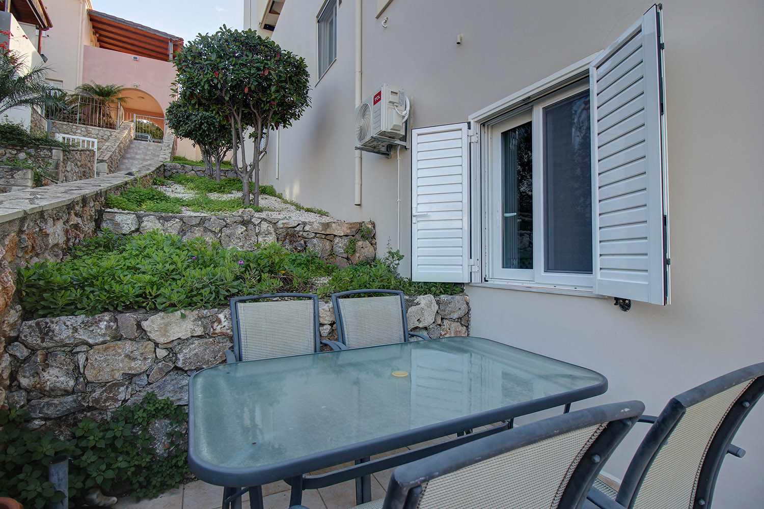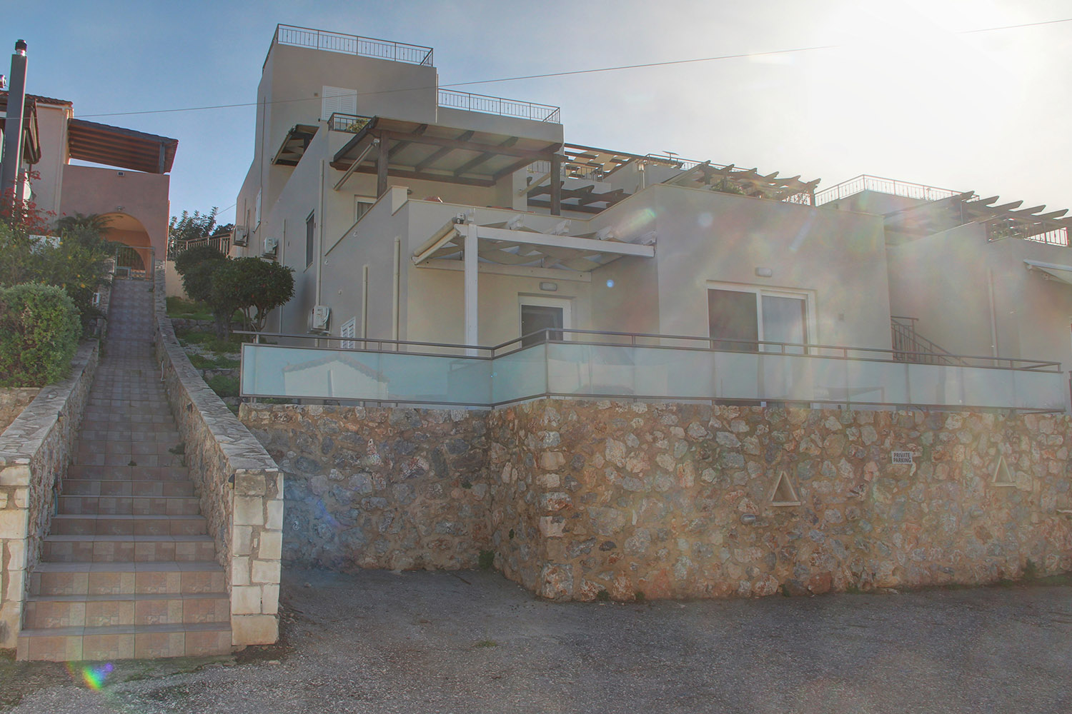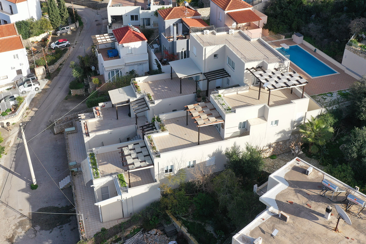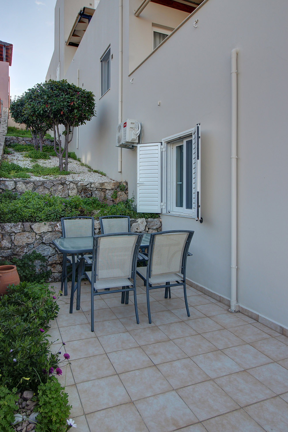 Το διαμέρισμα βρίσκεται σε ένα προσεγμένο συγκρότημα 7 κατοικιών, οι οποίες ως επί το πλείστον χρησιμοποιούνται εποχικά. Μεταξύ τους μοιράζονται κοινόχρηστες αυλές, παρτέρια, έναν άνετο χώρο στάθμευσης καθώς και μία πισίνα 39 m² με μεγάλο περιβάλλοντα χώρο. Το συγκρότημα είναι διαμορφωμένο σε αναβαθμίδες που ακολουθούν την κλίση του φυσικού εδάφους. Το διαμέρισμα είναι στη χαμηλότερη στάθμη με εύκολη πρόσβαση από τον χώρο στάθμευσης.