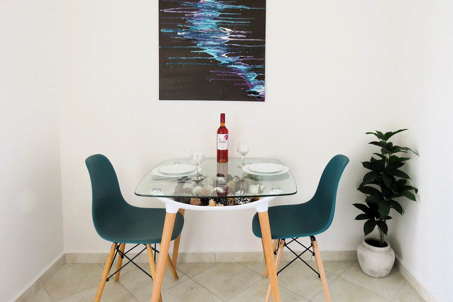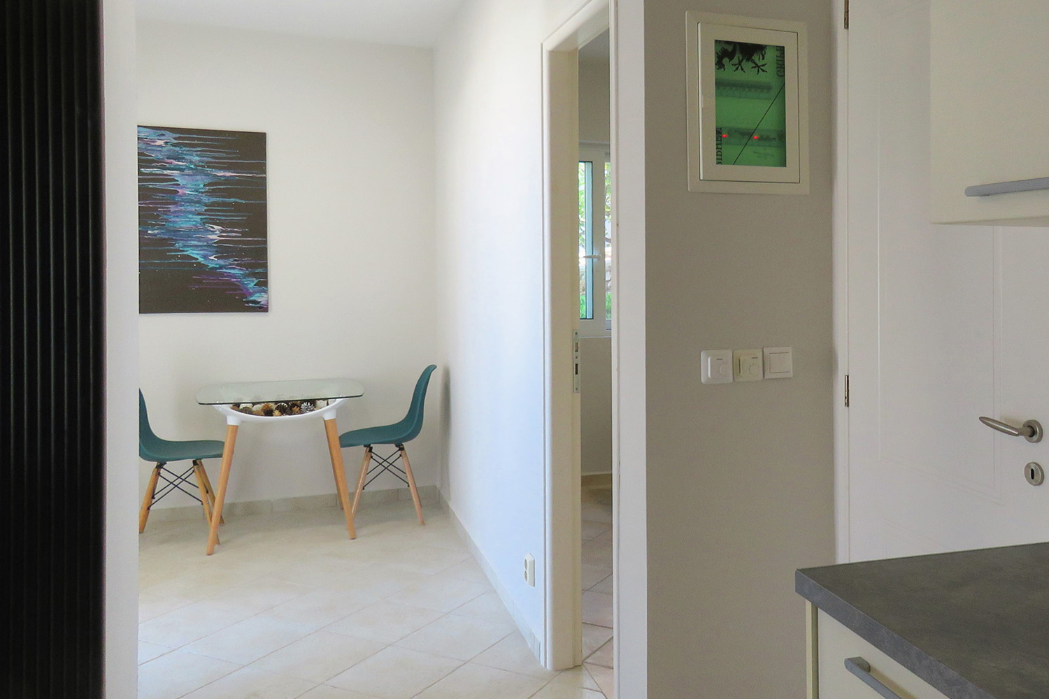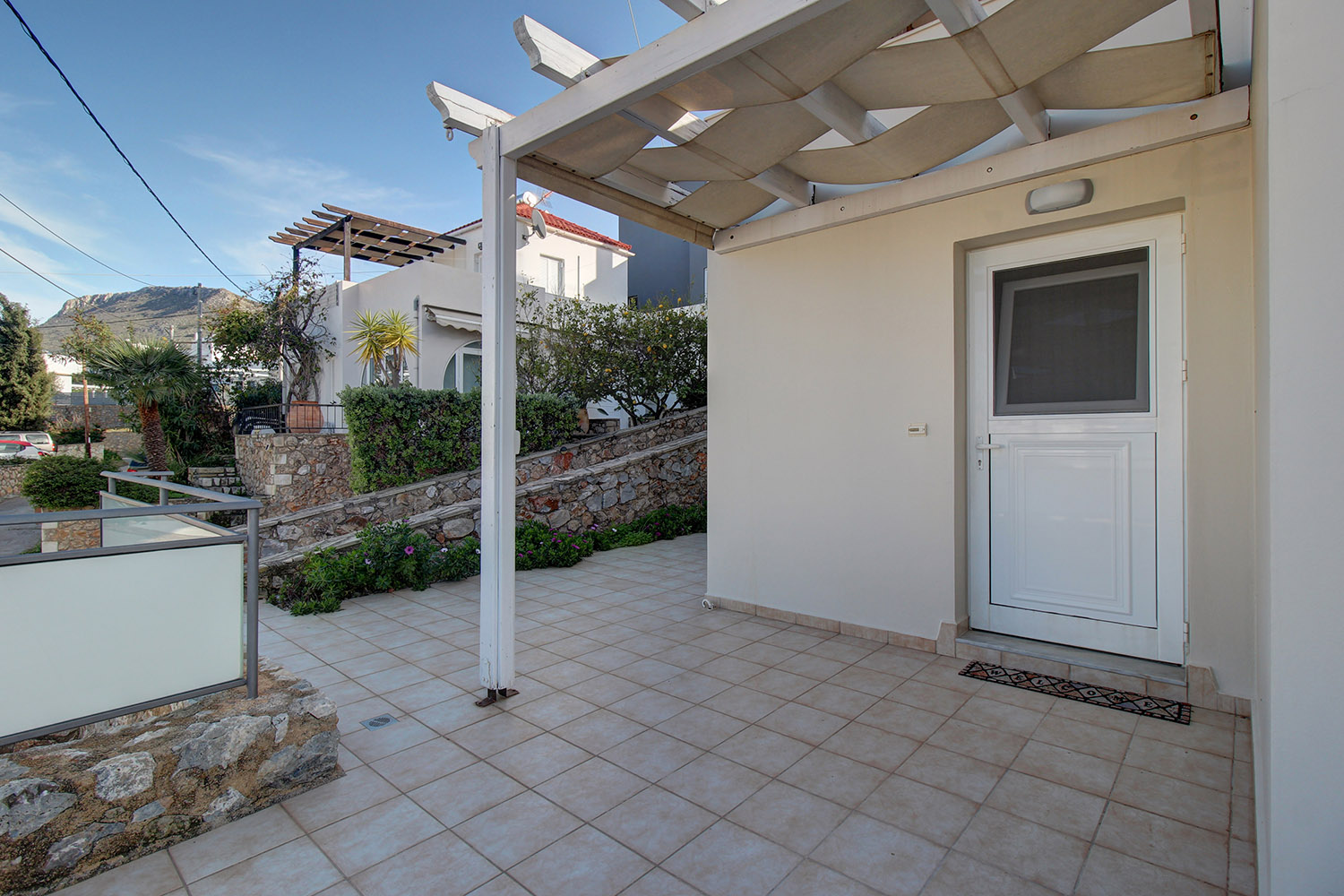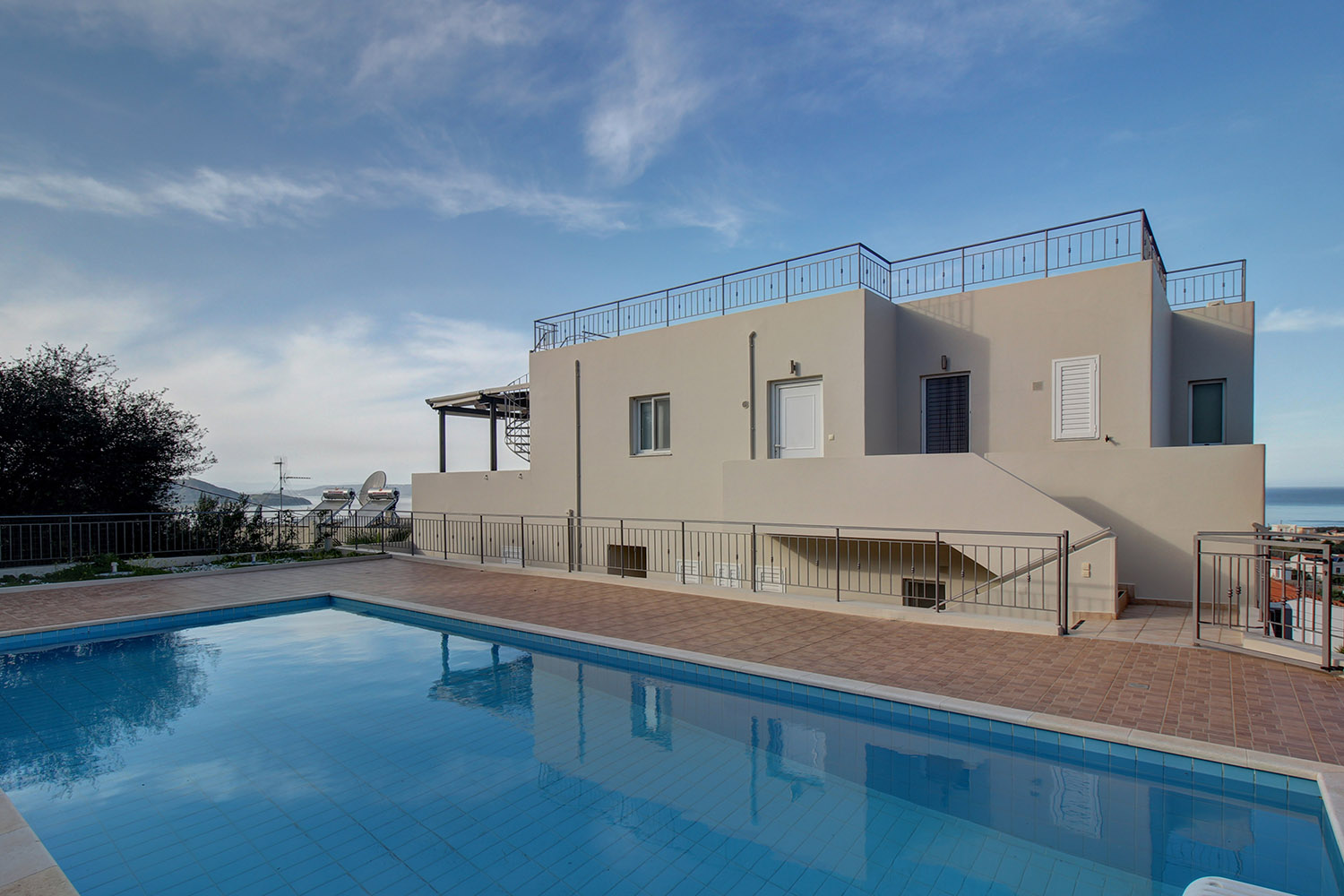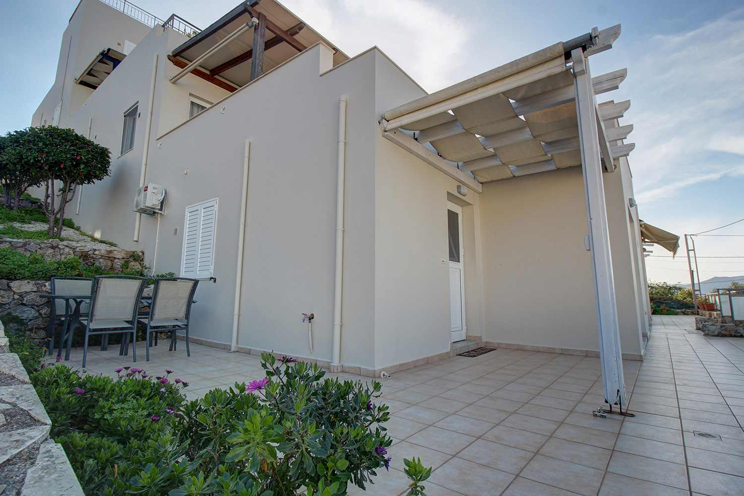 Το διαμέρισμα βρίσκεται σε ένα προσεγμένο συγκρότημα 7 κατοικιών, οι οποίες ως επί το πλείστον χρησιμοποιούνται εποχικά. Μεταξύ τους μοιράζονται κοινόχρηστες αυλές, παρτέρια, έναν άνετο χώρο στάθμευσης καθώς και μία πισίνα 39 m² με μεγάλο περιβάλλοντα χώρο. Το συγκρότημα είναι διαμορφωμένο σε αναβαθμίδες που ακολουθούν την κλίση του φυσικού εδάφους. Το διαμέρισμα είναι στη χαμηλότερη στάθμη με εύκολη πρόσβαση από τον χώρο στάθμευσης.