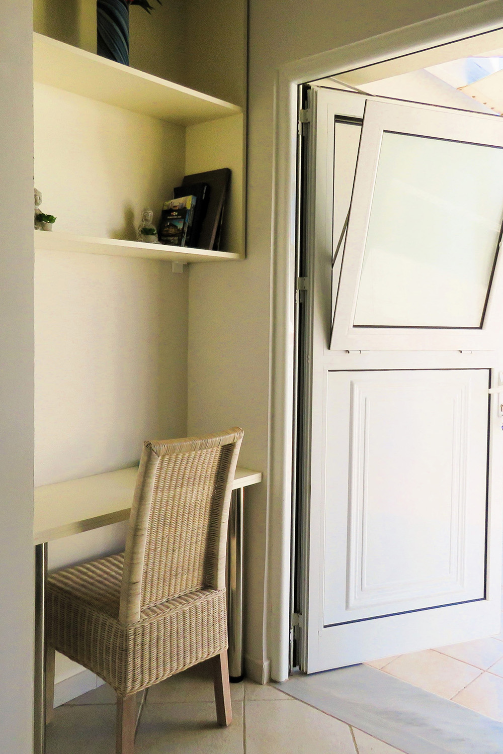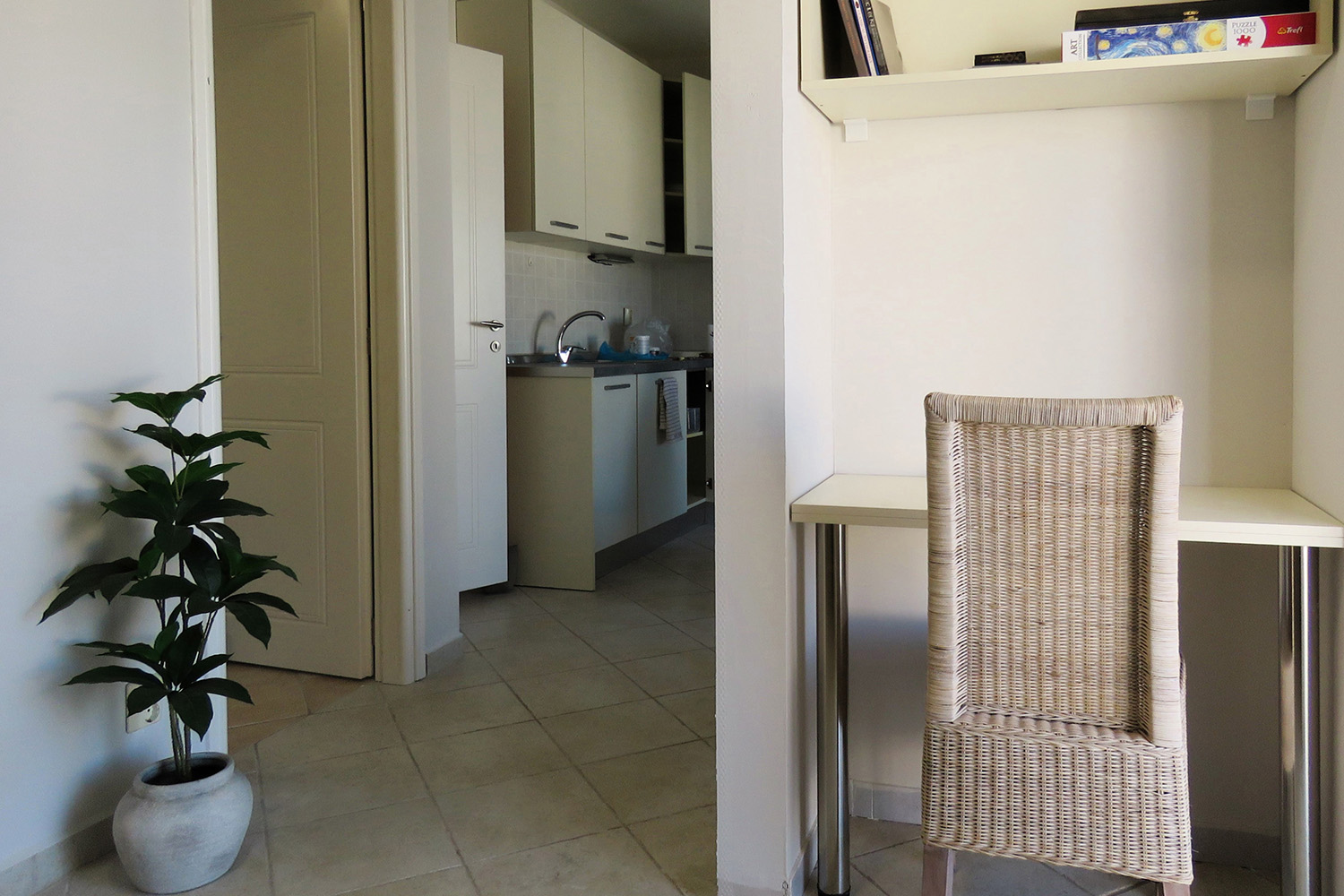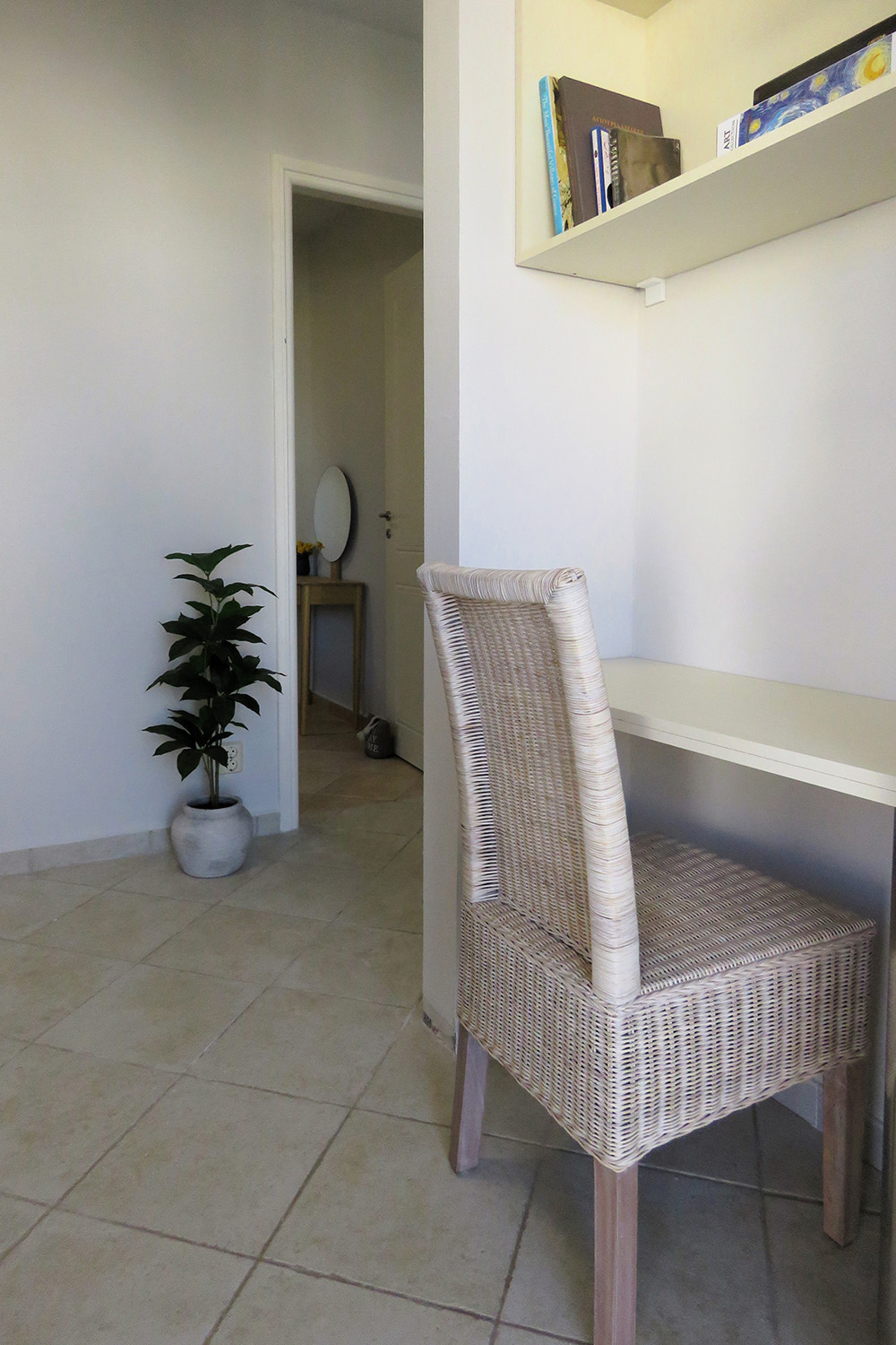 Πριν την είσοδο μας υποδέχεται μία αυλή, ένα τμήμα της οποίας σκιάζεται με πέργκολα ενώ σε όλη την πρόσοψη υπάρχουν σημεία με θέα στη θάλασσα. Στο εσωτερικό συναντάμε ένα άνετο χολ υποδοχής με χώρο γραφείου ενώ η κουζίνα και το σαλόνι τοποθετούνται διακριτικά σε έναν χώρο ακριβώς δίπλα. Στο βάθος βρίσκονται το υπνοδωμάτιο και το μπάνιο του σπιτιού, το οποίο είναι αρκετά άνετο και έχει καμπίνα ντους και πλυντήριο ρούχων. Στο διαμέρισμα έχει γίνει μόλις πρόσφατα μία καλή συντήρηση ώστε να παραδίδεται ένα καλό και λειτουργικό ακίνητο, για άμεση χρήση. Τα έπιπλα και οι ηλεκτρικές συσκευές είναι, επίσης, καινούρια, αχρησιμοποίητα και συμπεριλαμβάνονται στην τιμή πώλησης. Τέλος, το ακίνητο διαθέτει κλιματιστικά στον ενιαίο χώρο και το υπνοδωμάτιο καθώς και πορτοπαράθυρα αλουμινίου με σήτες και διπλά τζάμια.