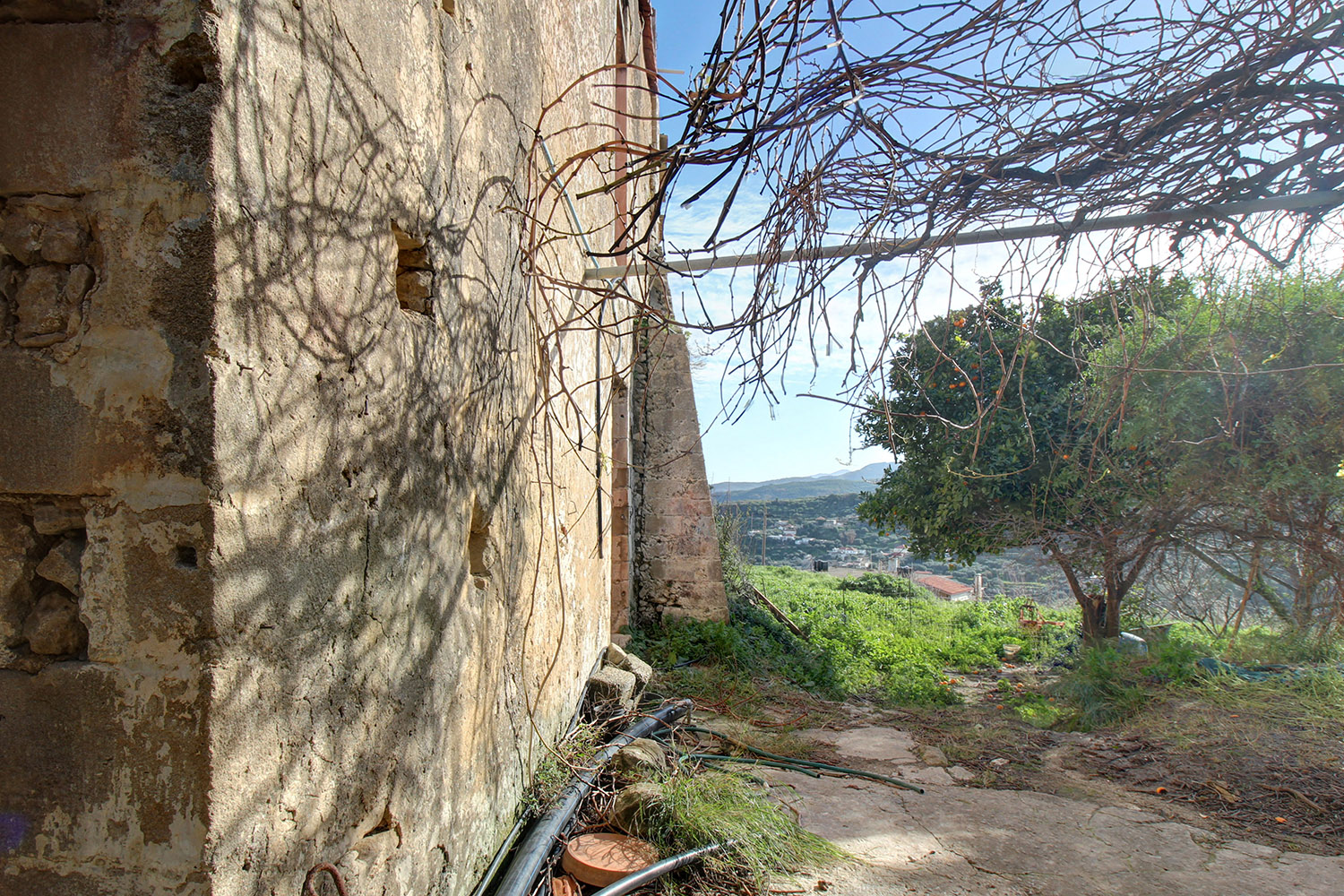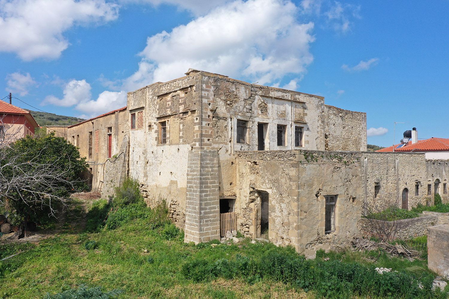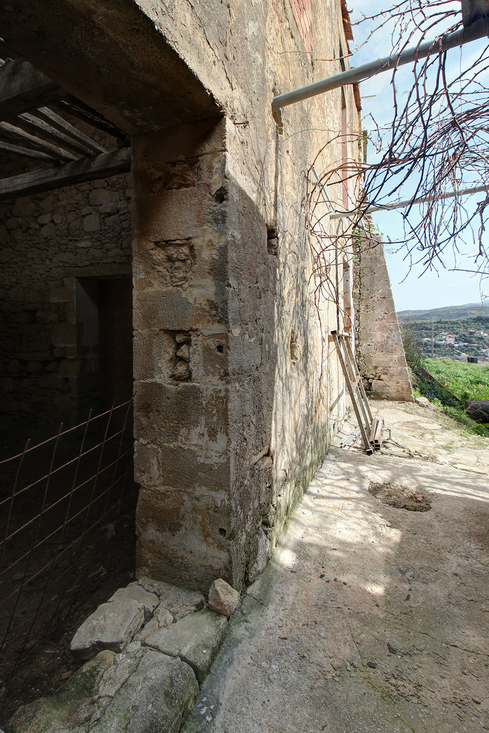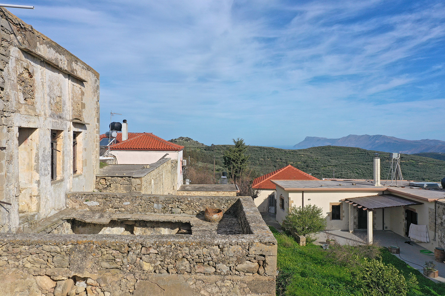 Το κτίσμα έχει δύο κύριες όψεις που κοιτούν νότια και ανατολικά ενώ σε συνέχειά του υπάρχει αρκετός χώρος, όπου μπορούν να προστεθούν άνετος κήπος, χώροι στάθμευσης ή πισίνα. Κατά μήκος της πρόσοψης του οικοπέδου υπάρχει ψηλό πρανές, το οποίο προσθέτει ιδιωτικότητα και διασφαλίζει όμορφη θέα στην κατάφυτη γύρω περιοχή ενώ υπάρχει και δεύτερη εναλλακτική πρόσβαση. Στον όροφο υπάρχει, επίσης, ένα άνετο ανατολικό μπαλκόνι που μεταξύ άλλων κοιτά στη θάλασσα και στον κόλπο της Κισσάμου στο βάθος. Το κτίσμα είναι πέτρινο στο σύνολό του. Είναι σε δύο επίπεδα και κατά καιρούς έχουν γίνει παρεμβάσεις σε διάφορα σημεία. Ως εκ τούτου ένα τμήμα να είναι πλακοσκεπές και ένα άλλο έχει κεραμίδια. Μεταξύ άλλων, στο εσωτερικό του ακινήτου υπάρχουν λίθινες γούρνες, θυρίδες στις τοιχοποιίες καθώς και μία εντυπωσιακή βενετσιάνικη κουζίνα με παρασιά στον επάνω όροφο.
