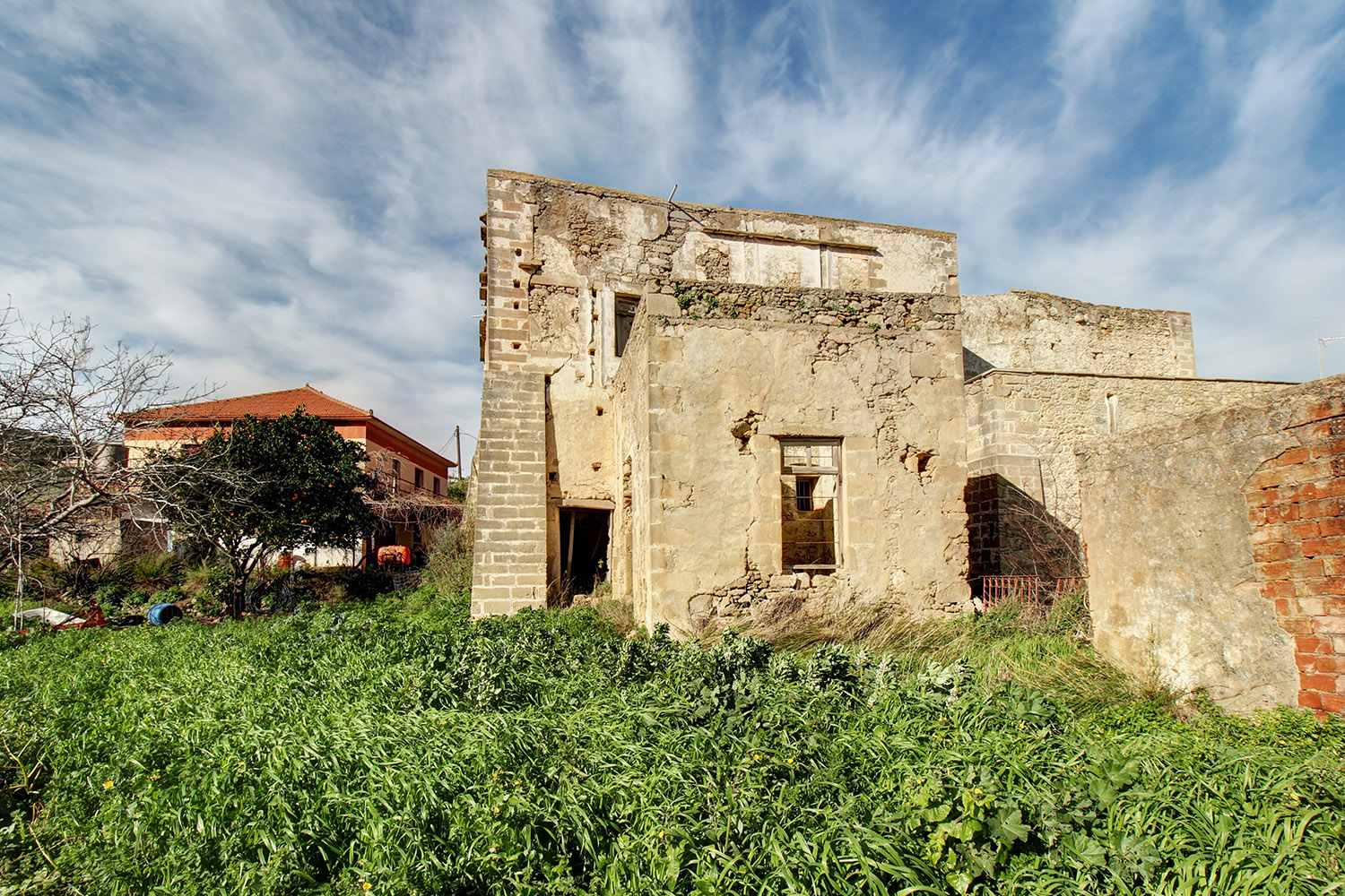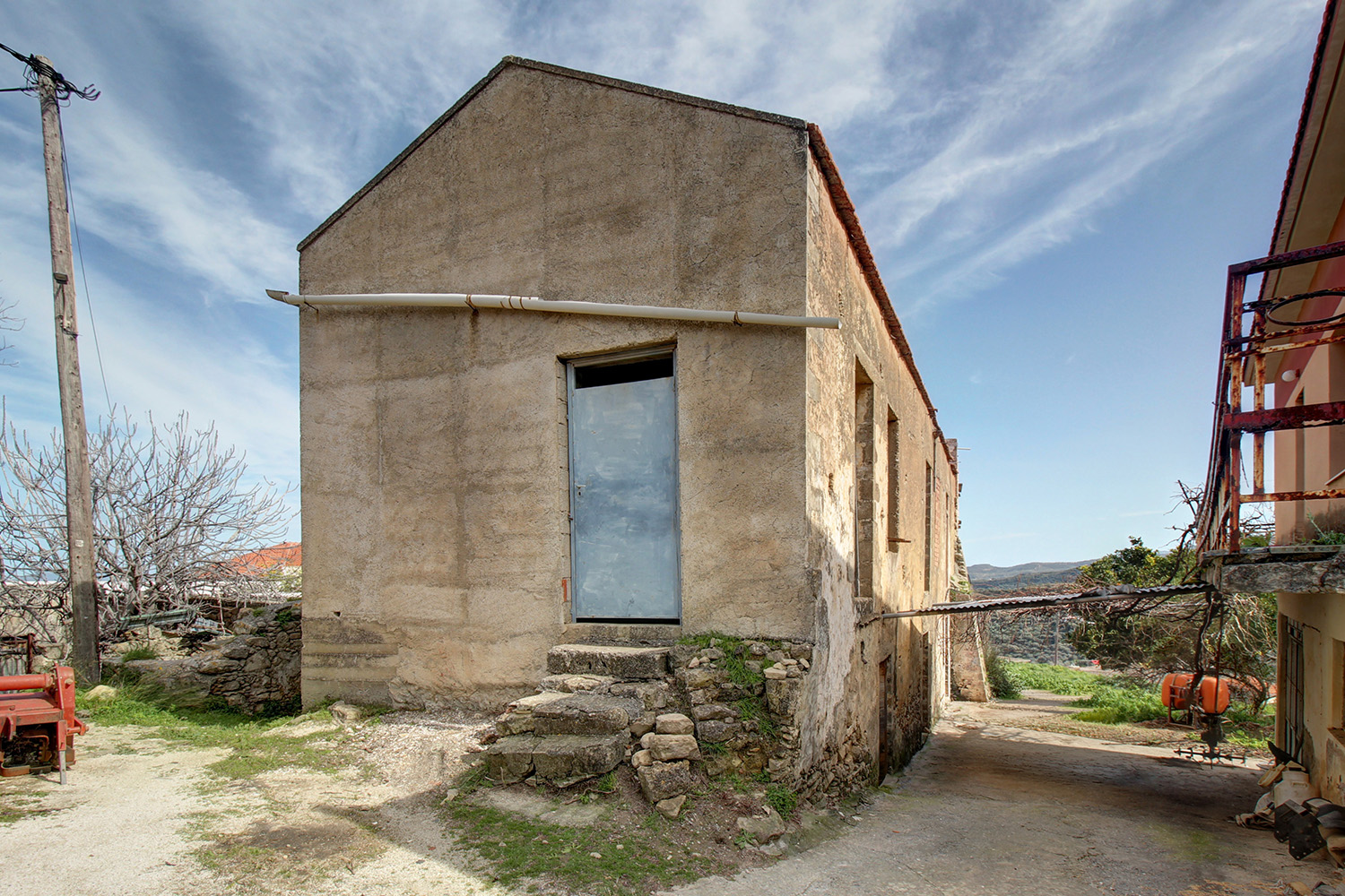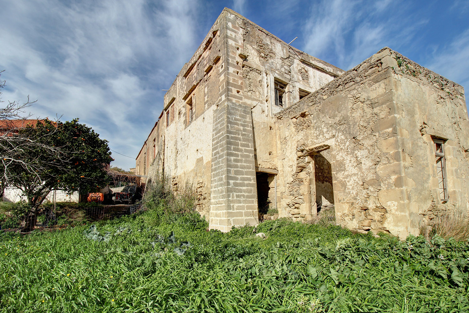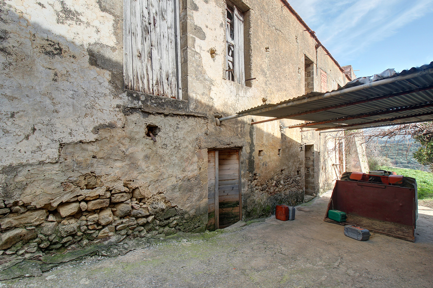 Το κτίσμα έχει δύο κύριες όψεις που κοιτούν νότια και ανατολικά ενώ σε συνέχειά του υπάρχει αρκετός χώρος, όπου μπορούν να προστεθούν άνετος κήπος, χώροι στάθμευσης ή πισίνα. Κατά μήκος της πρόσοψης του οικοπέδου υπάρχει ψηλό πρανές, το οποίο προσθέτει ιδιωτικότητα και διασφαλίζει όμορφη θέα στην κατάφυτη γύρω περιοχή ενώ υπάρχει και δεύτερη εναλλακτική πρόσβαση. Στον όροφο υπάρχει, επίσης, ένα άνετο ανατολικό μπαλκόνι που μεταξύ άλλων κοιτά στη θάλασσα και στον κόλπο της Κισσάμου στο βάθος. Το κτίσμα είναι πέτρινο στο σύνολό του. Είναι σε δύο επίπεδα και κατά καιρούς έχουν γίνει παρεμβάσεις σε διάφορα σημεία. Ως εκ τούτου ένα τμήμα να είναι πλακοσκεπές και ένα άλλο έχει κεραμίδια. Μεταξύ άλλων, στο εσωτερικό του ακινήτου υπάρχουν λίθινες γούρνες, θυρίδες στις τοιχοποιίες καθώς και μία εντυπωσιακή βενετσιάνικη κουζίνα με παρασιά στον επάνω όροφο.