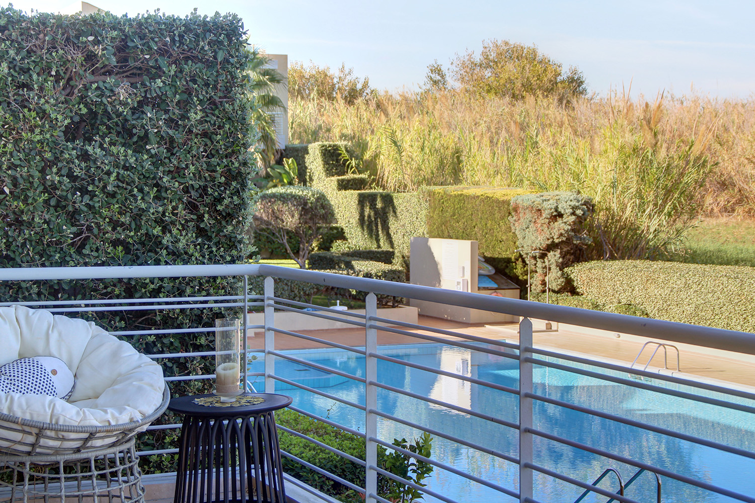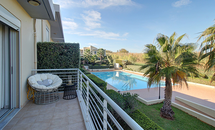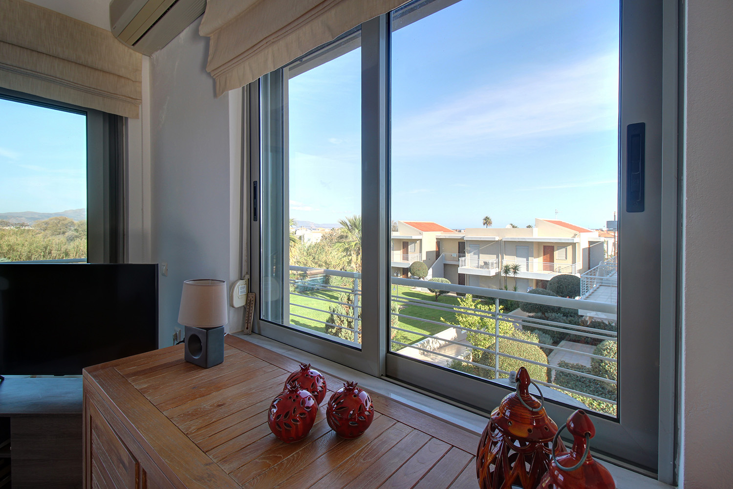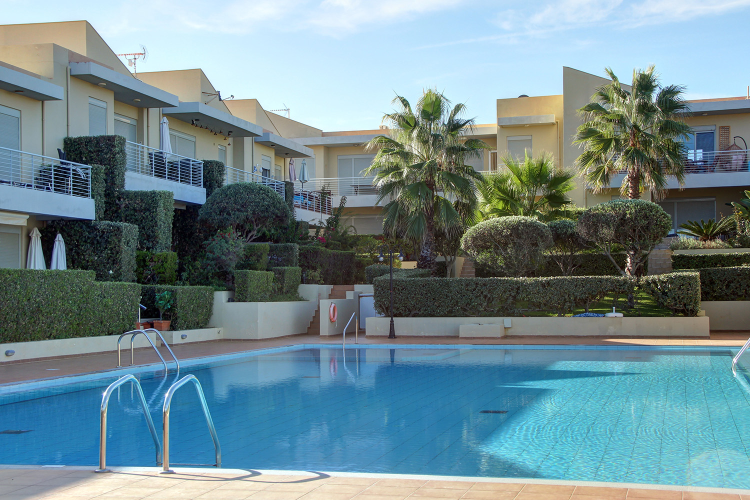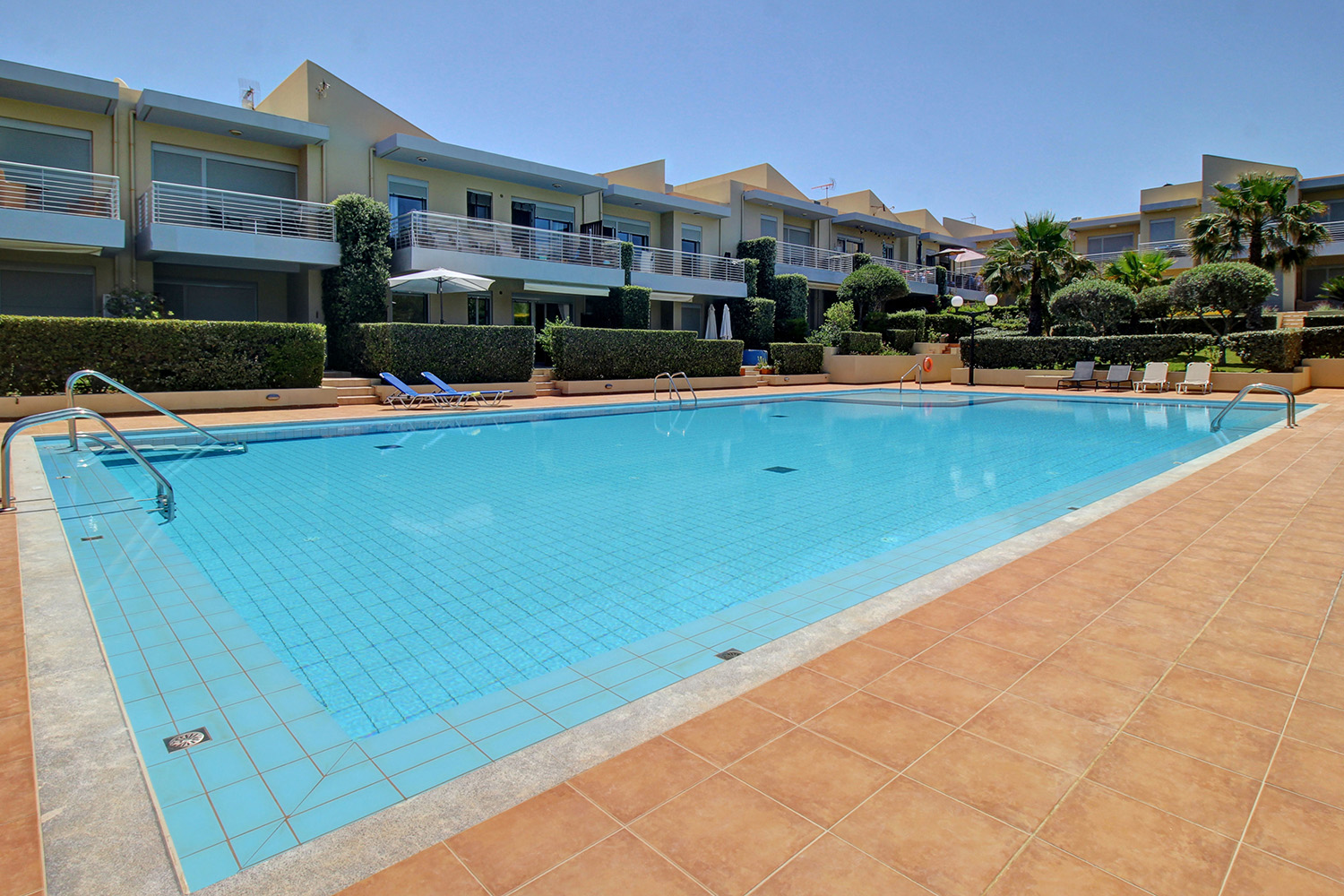 Μπαίνοντας από την κύρια είσοδο βρίσκουμε έναν ενιαίο χώρο κουζίνας, τραπεζαρίας και σαλονιού. Η κουζίνα διαθέτει ντουλάπια και όλες τις ηλεκτρικές συσκευές. Προχωρώντας, συναντάμε ένα χολ που οδηγεί στο μπάνιο και στη συνέχεια, σε δύο υπνοδωμάτια με άνετες ντουλάπες. Η κατοικία διαθέτει μεγάλη βεράντα με θέα στην πισίνα, από την πλευρά του σαλονιού και ένα μπαλκόνι, από την πλευρά των υπνοδωματίων. Το διαμέρισμα διαθέτει κλιματισμό, ηλεκτρικό θερμοσίφωνα και κουφώματα ξύλου και αλουμινίου με παντζούρια.