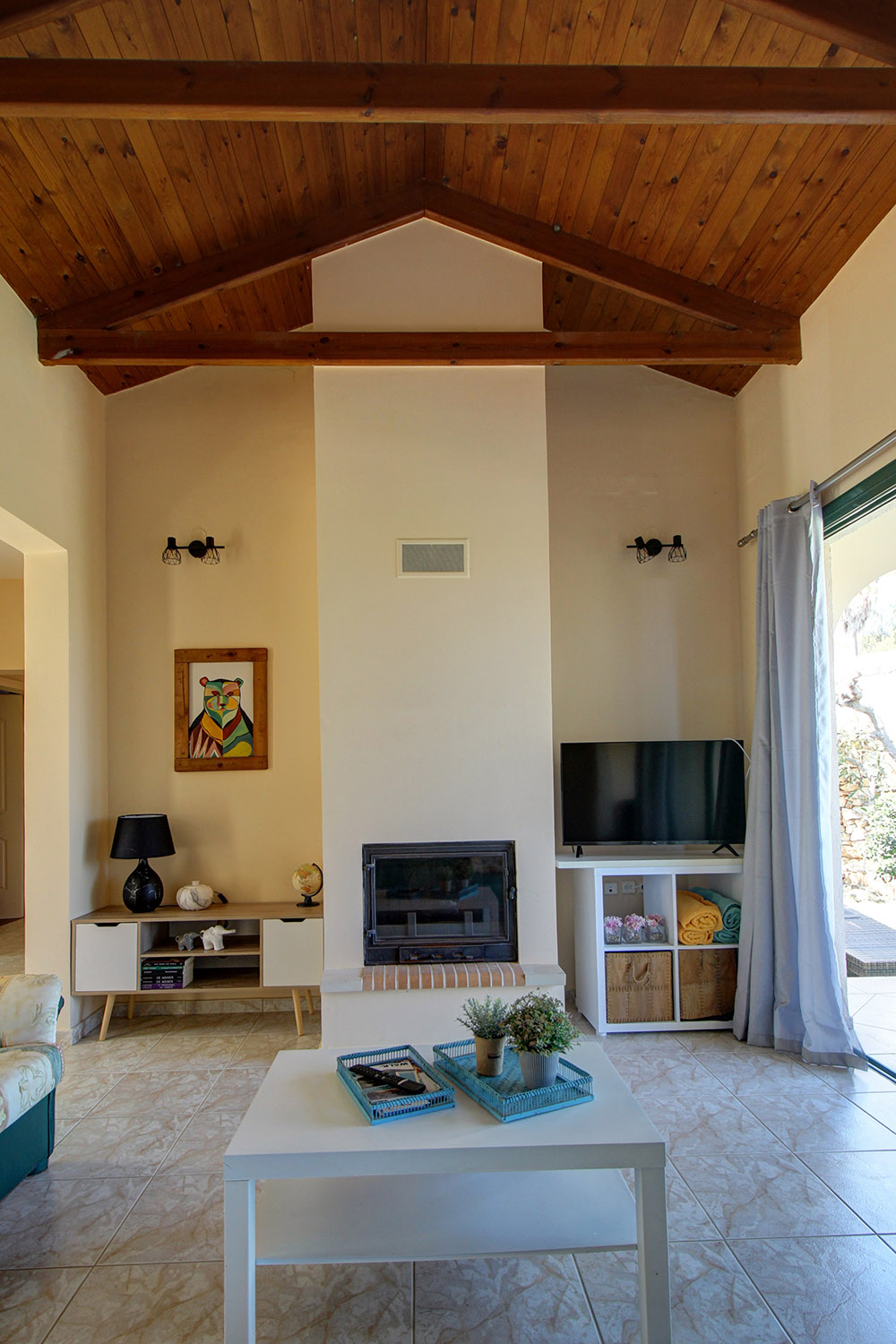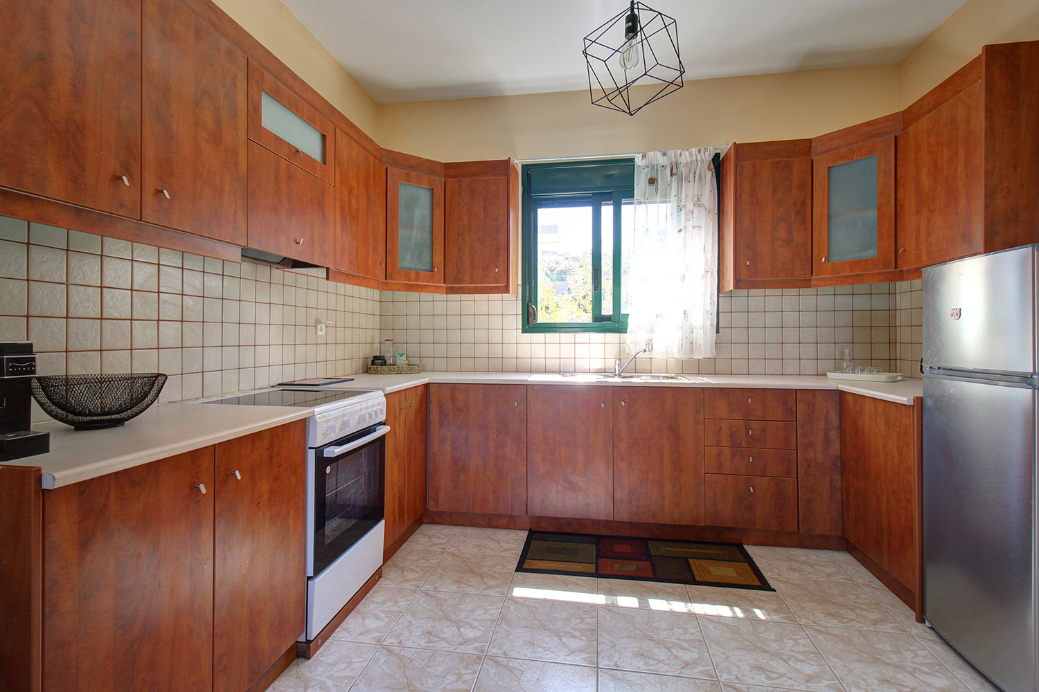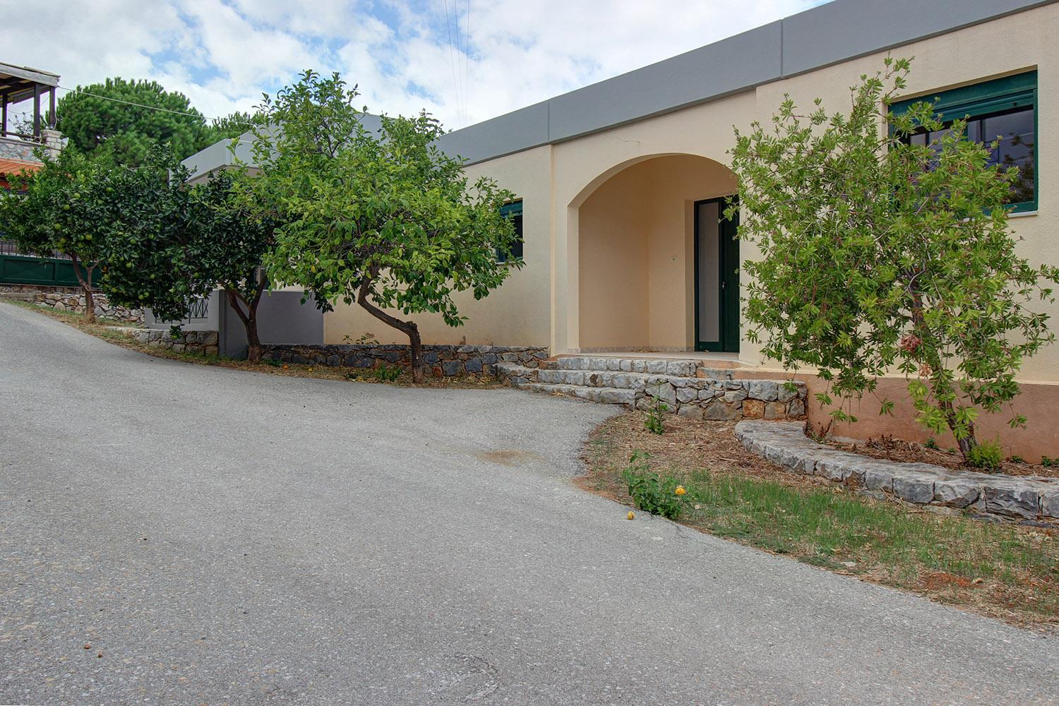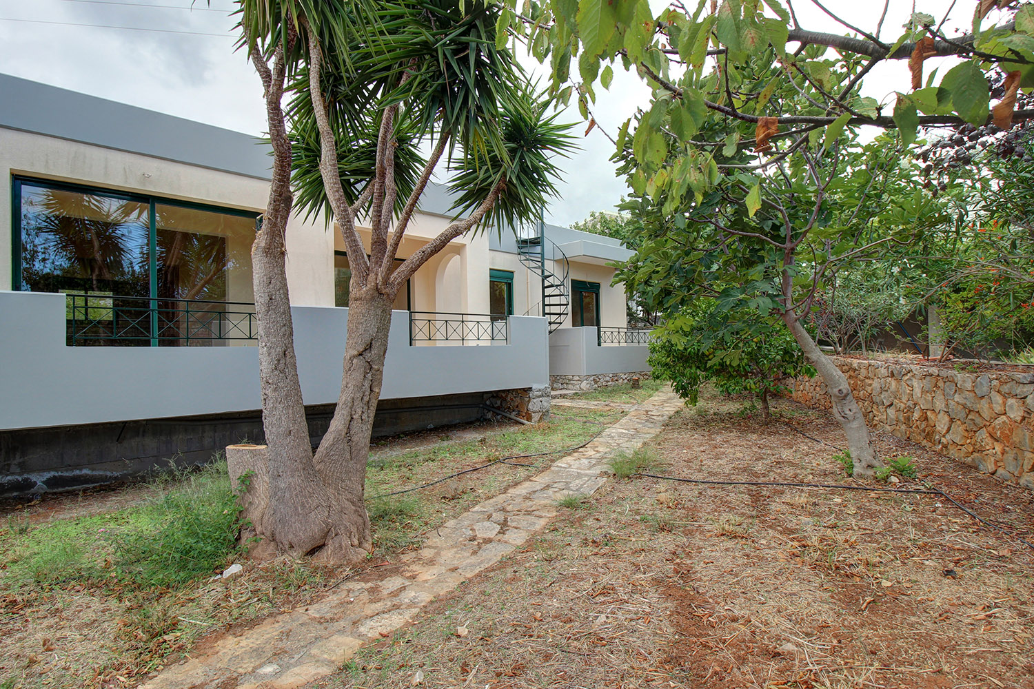 Το σπίτι βρίσκεται σε ένα όμορφο συγκρότημα τεσσάρων κατοικιών που μοιράζονται μία κοινή είσοδο και οικόπεδο 1,350 m². Μπροστά από την κατοικία υπάρχουν ένας μικρός κήπος, αυλή και άνετος χώρος στάθμευσης. Στην πίσω πλευρά είναι ένας περιφραγμένος κήπος με μεγάλα δέντρα και λουλούδια. Μπαίνοντας από την κύρια είσοδο συναντάμε έναν ενιαίο χώρο με ψηλό ξύλινο ταβάνι και τζάκι. Εκεί βρίσκεται και η άνετη κουζίνα, η οποία έχει αρκετά ντουλάπια. Από τον ενιαίο χώρο βγαίνουμε σε μία μεγάλη σκεπαστή βεράντα με βορεινό προσανατολισμό και θέα στον κήπο. Ένας διάδρομος οδηγεί σε δύο υπνοδωμάτια, ένα μπάνιο με μπανιέρα και ένα WC. Τα υπνοδωμάτια διαθέτουν άνετες ντουλάπες και μπαλκονόπορτες που βγάζουν στον κήπο. Μία σιδερένια εξωτερική σκάλα οδηγεί στην ταράτσα, η οποία μπορεί να τροποποιηθεί ώστε να χρησιμοποιηθεί ως roof terrace. Η οικία διαθέτει ηλιακό θερμοσίφωνα, ενεργειακό τζάκι και παράθυρα αλουμινίου με διπλά τζάμια και σήτες.