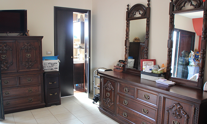 Ανεβαίνοντας με σκάλες στον όροφο πηγαίνουμε στο μεγάλο διαμέρισμα. Μπαίνοντας στο εσωτερικό του συναντάμε ένα χώρο υποδοχής με ντουλάπες σε έναν άνετο διάδρομο. Υπάρχει ένας τεράστιος ενιαίος χώρος που έχει από τη μία πλευρά του, την κουζίνα και μία μεγάλη σκεπαστή βεράντα και από την άλλη, το χώρο της τραπεζαρίας και στο βάθος, το χώρο του σαλονιού. Στην ευρύχωρη κουζίνα υπάρχουν όλων των ειδών οι ηλεκτρικές συσκευές και αρκετά ντουλάπια με μοντέρνο στυλ και χρώμα. Το σαλόνι έχει ένα τζάκι και μεγάλα παράθυρα που βλέπουν στη θάλασσα. Το σπίτι διαθέτει ένα πολύ μεγάλο μπάνιο με διπλό νιπτήρα, μπανιέρα με τζακούζι, οργανωμένο χώρο με πλυντήριο και στεγνωτήριο καθώς και μεγάλες ντουλάπες. Υπάρχουν επίσης τρία υπνοδωμάτια με ντουλάπες, μπαλκόνια και κλιματιστικά. Το ένα από αυτά έχει και εσωτερικό μπάνιο με ντουζιέρα και δωμάτιο-ντουλάπα.